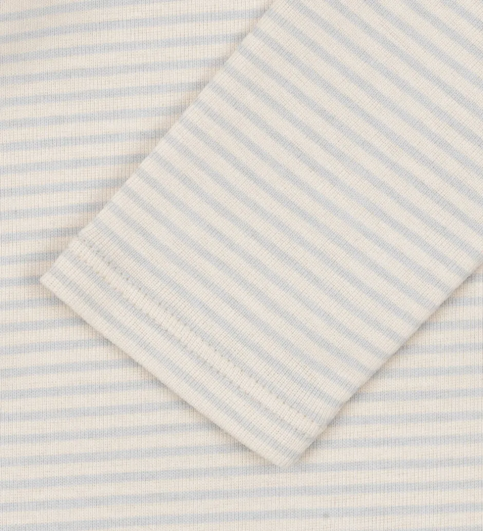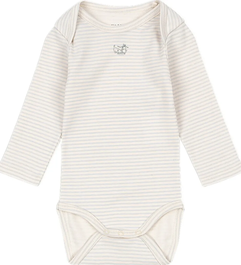 Praktisk Fanga Fontana body med lange ærmer og et stribet mønster i bløde nuancer af lyseblå og cremehvid. På brystet ses et enkelt, lille print af to katte. Bodyen er udstyret med ribkanter ved hals og håndled, der giver en god pasform.