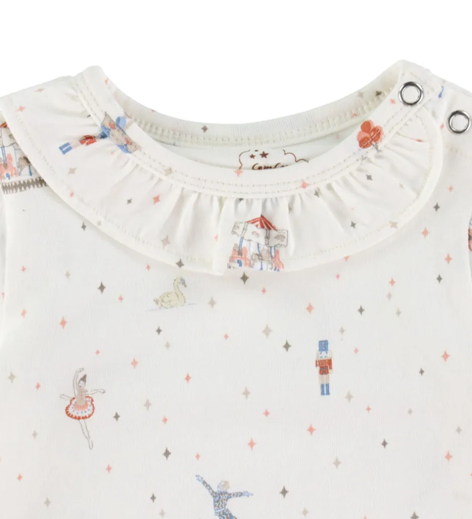 Fin Cam Cam body i hvid med print af små eventyrlige motiver. Bodyen har en rund halsudskæring med flæsekant og trykknapper ved venstre skulder. Bodyen har lange ærmer og lukkes med trykknapper mellem benene.