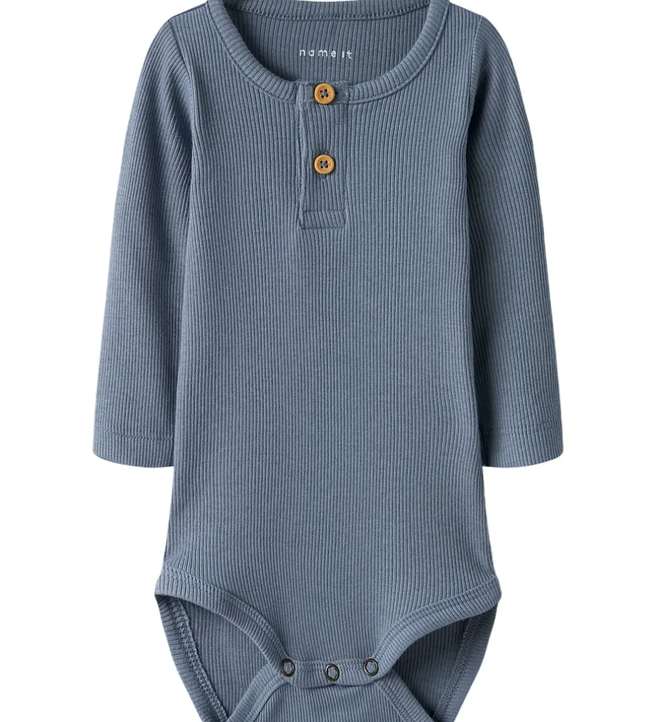 Flotte Name It bodyer solgt i en 2-pak i ensfarvet blå og støvet lysegrøn med ribstruktur. Bodyerne har en rund halsudskæring med knapper foran. De har lange ærmer og lukkes med trykknapper mellem benene.