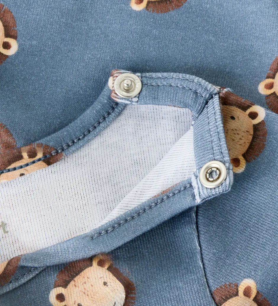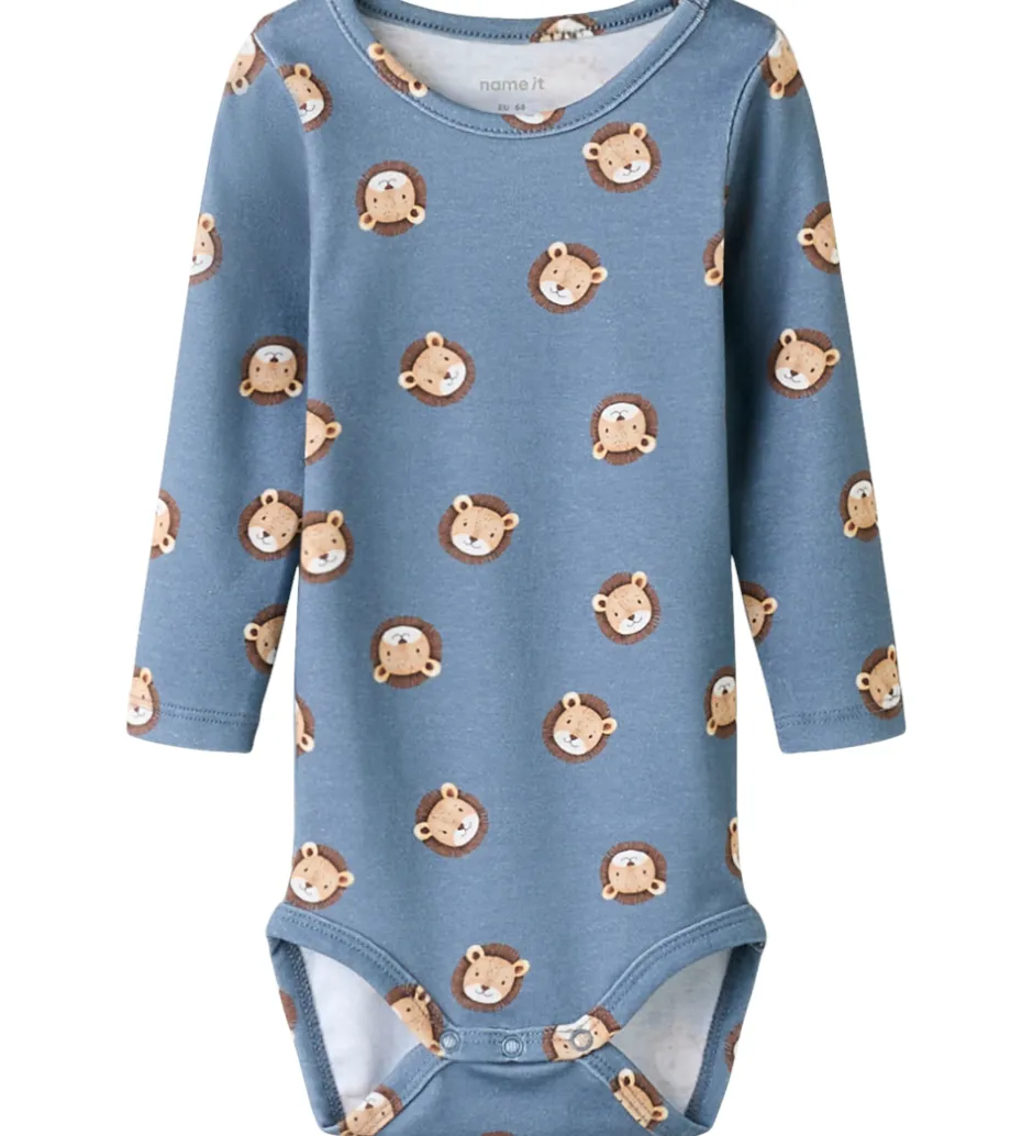 Flot Name It body i blå med et alloverprint af søde løvehoveder. Bodyen har lange ærmer og lukkes med trykknapper ved venstre skulder samt mellem benene.