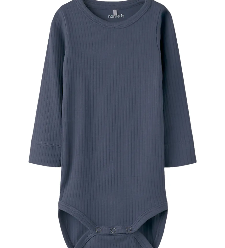 Flot Name It body i støvet blå med ribstruktur. Name It bodyen har en rund halsudskæring med en trykknap ved venstre skulder og lange ærmer. Den lukkes med trykknapper mellem benene.