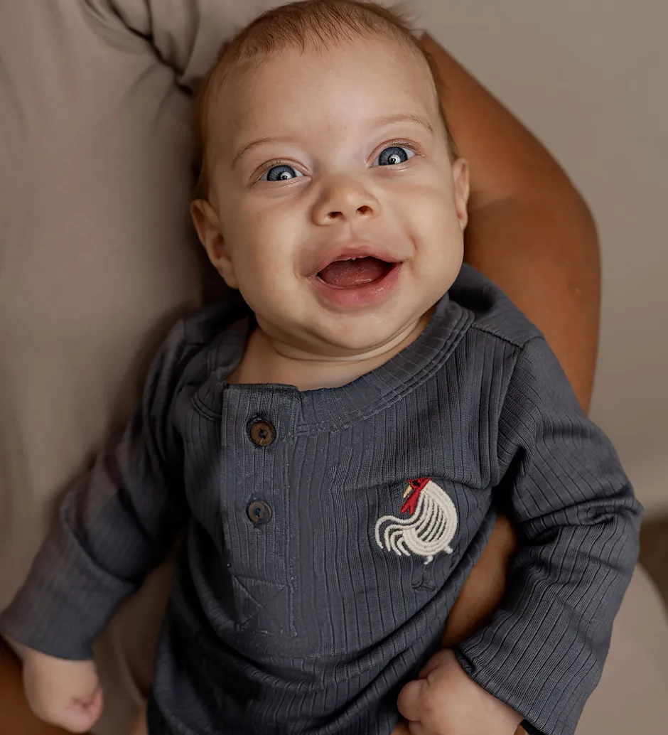 Flot Hanevild body i støvet blå med ribstruktur og en broderet hane på venstre bryst. Hanevild bodyen har lange ærmer samt en rund halsudskæring. Der er praktiske knapper foran og i bunden, så den er let at få af og på.