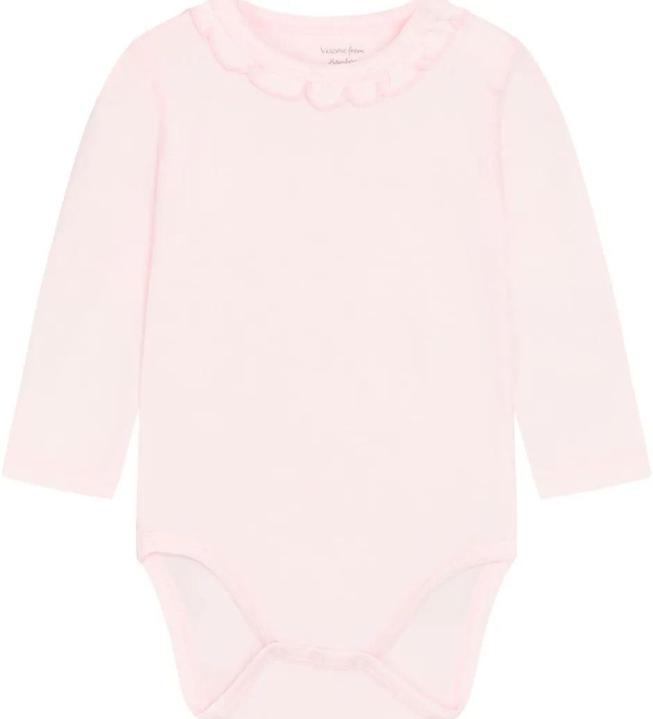 Elegant Hust and Claire body i en sart rosa nuance med lange ærmer og en fin rund halsudskæring. Bodyen har en flot flæsedetalje ved halsen, der tilføjer et ekstra feminint touch.