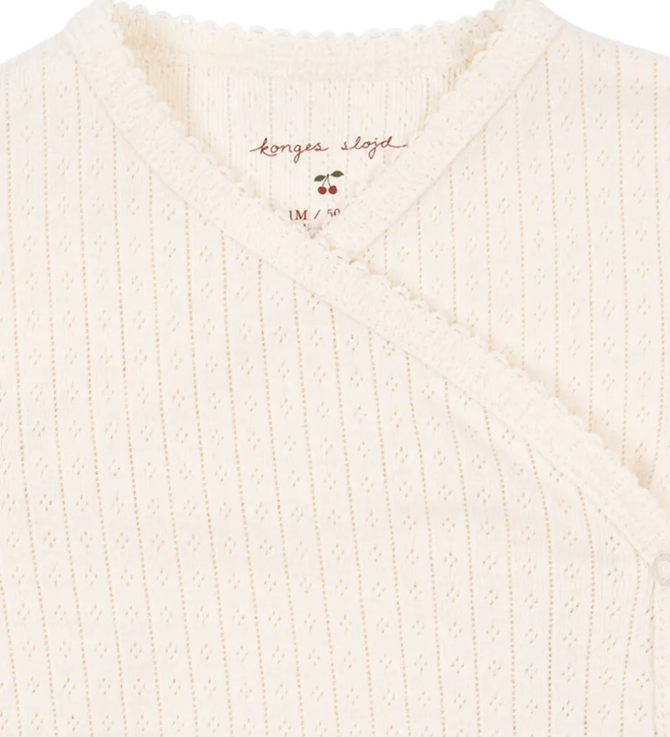 Elegant Konges Sløjd body med lange ærmer i en blød cremehvid. Bodyen har et diskret ribmønster og hulmønster, der tilføjer en smule struktur. Den lukkes med trykknapper langs siden og i bunden, hvilket gør den nem at åbne og lukke.