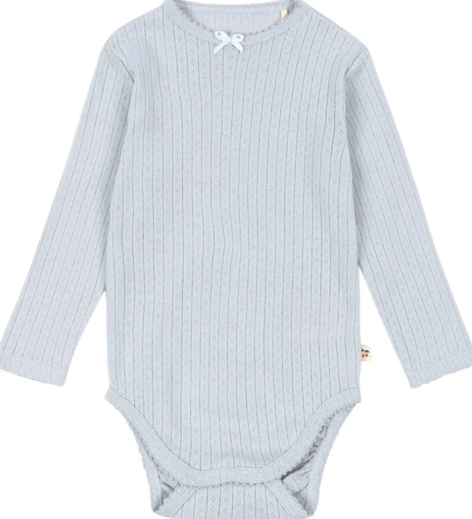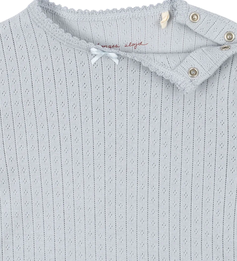 Elegant Konges Sløjd body med lange ærmer i en delikat, lyseblå nuance. En enkelt, dekorativ sløjfe pryder halsudskæringen, hvilket tilføjer et fint touch. Den ribbet struktur med et diskret hulmønster giver bodyen et stilfuldt udtryk.