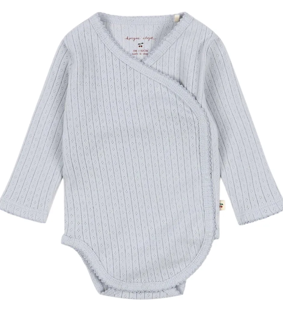 Elegant Konges Sløjd body i en blød, lyseblå nuance med ribstruktur og et flot hulmønster.