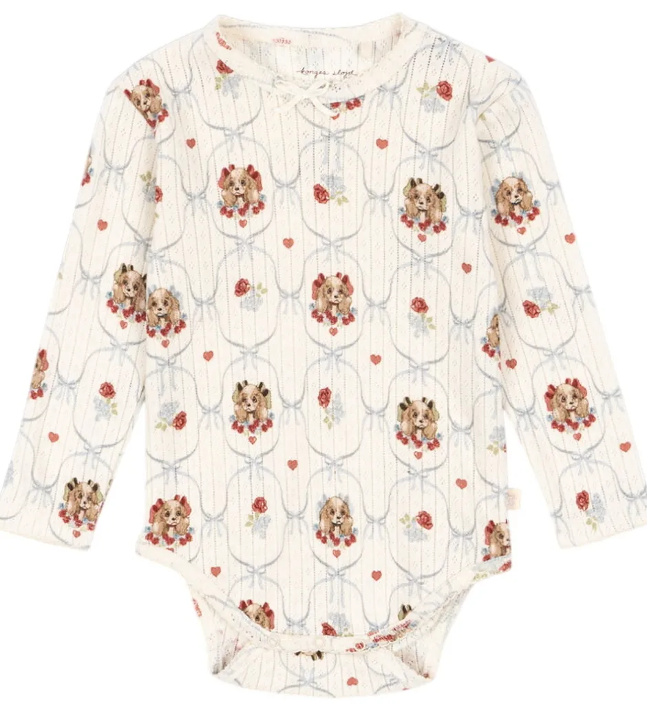 Charmerende Konges Sløjd body i lysebeige med lange ærmer. Bodyen har et fint mønster med hundemotiver, små hjerter og blomster i blå og rosa nuancer.