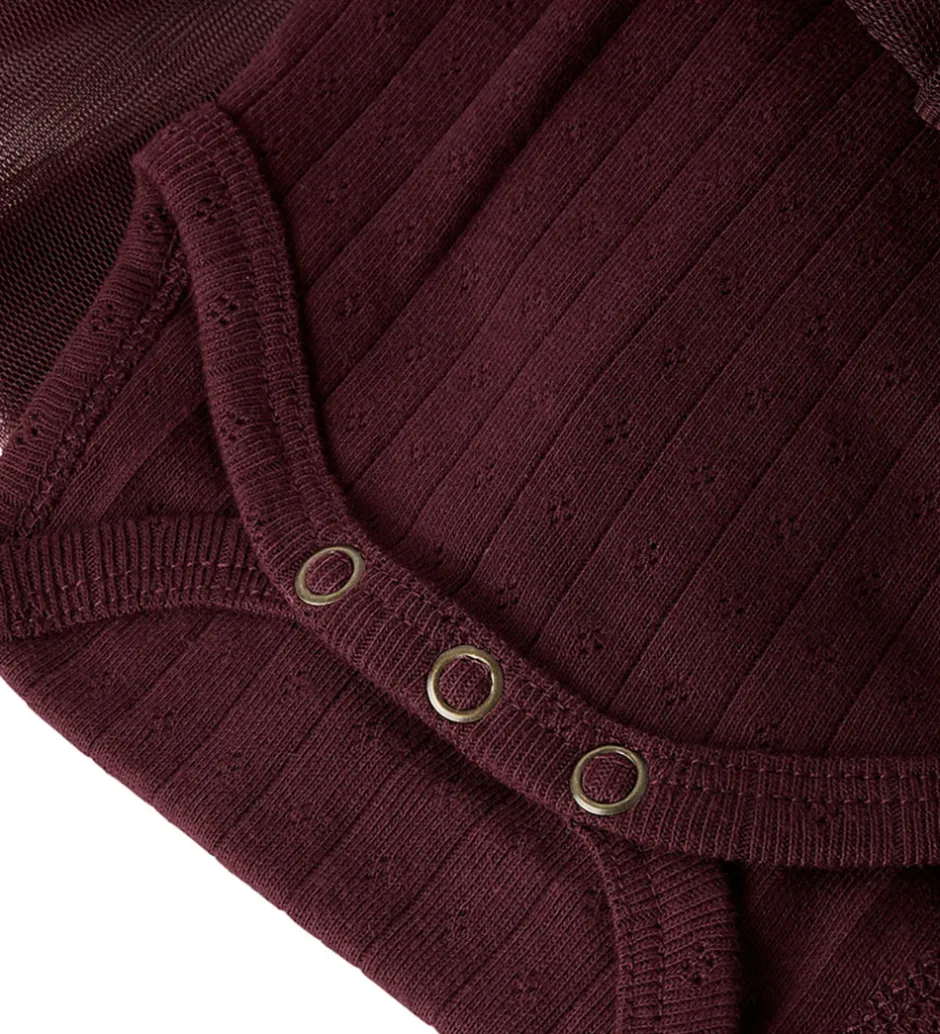 Elegant Lil Atelier kjolebody i mørkelilla med fint hulmønster og et skørt med flere lag tyl. Kjolebodyen har en rund halsudskæring med en flæsekant og lange ærmer. Den lukkes med trykknapper ved venstre skulder og mellem benene. Kjolebodyens skørt er påsyet lige under brystet.