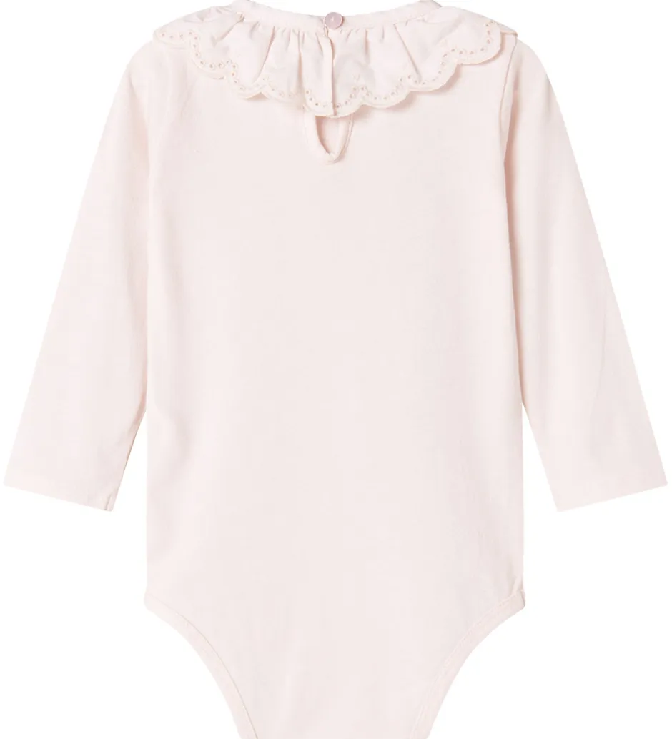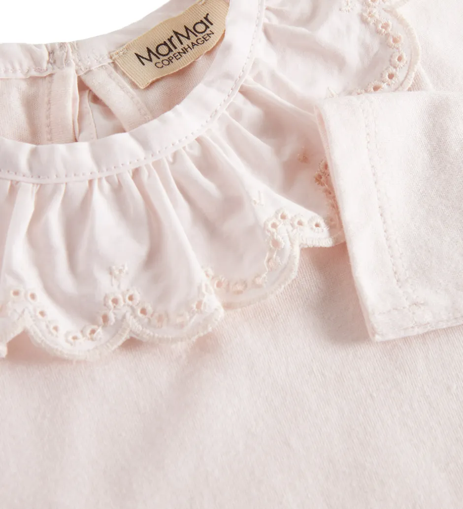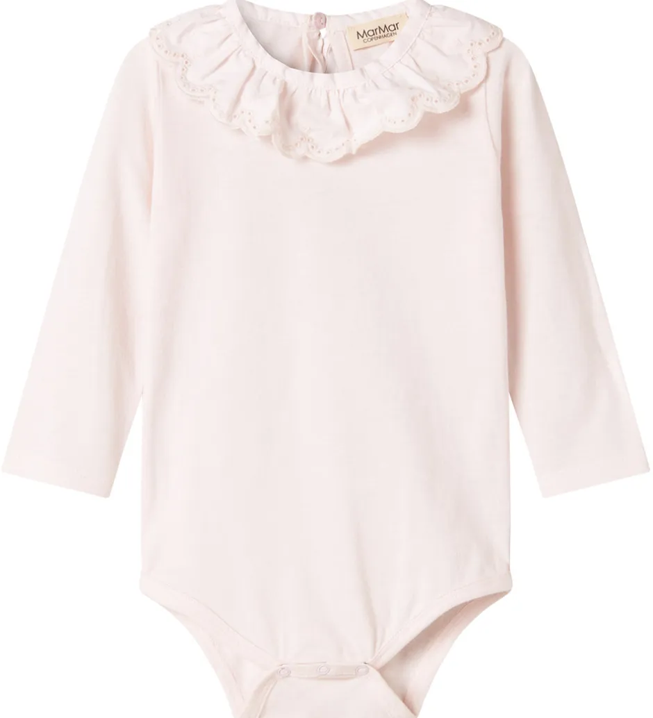 Elegant MarMar body i en sart, lyserosa farve. Denne body er udstyret med lange ærmer og har en dekorativ flæsekrave, der tilføjer et klassisk touch. Pasformen er designet med kantede detaljer ved ærmer og ben, hvilket giver et rent look.