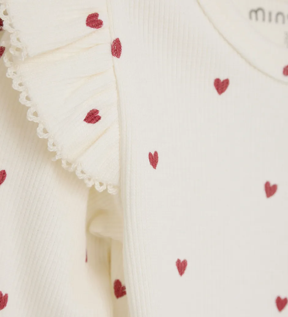 Charmerende Minymo body med lange ærmer i hvid med små røde hjerter overalt og med en flot ribstruktur. Bodyen har søde flæser på skuldrene, der tilføjer et fint aspekt. Minymo har designet bodyen har trykknapper mellem benenem, og den kan åbnes med skjulte trykknapper ved begge skuldre.