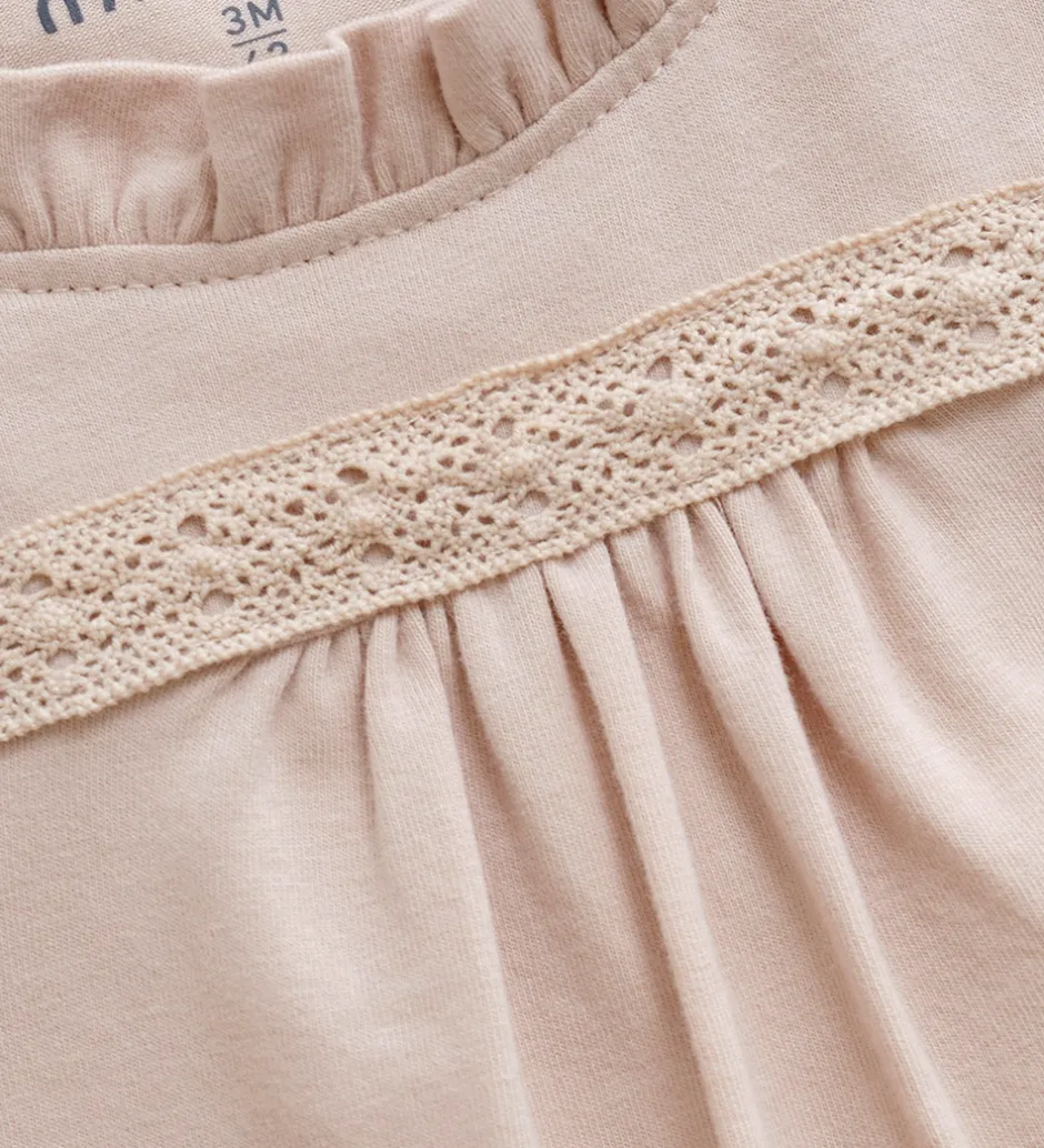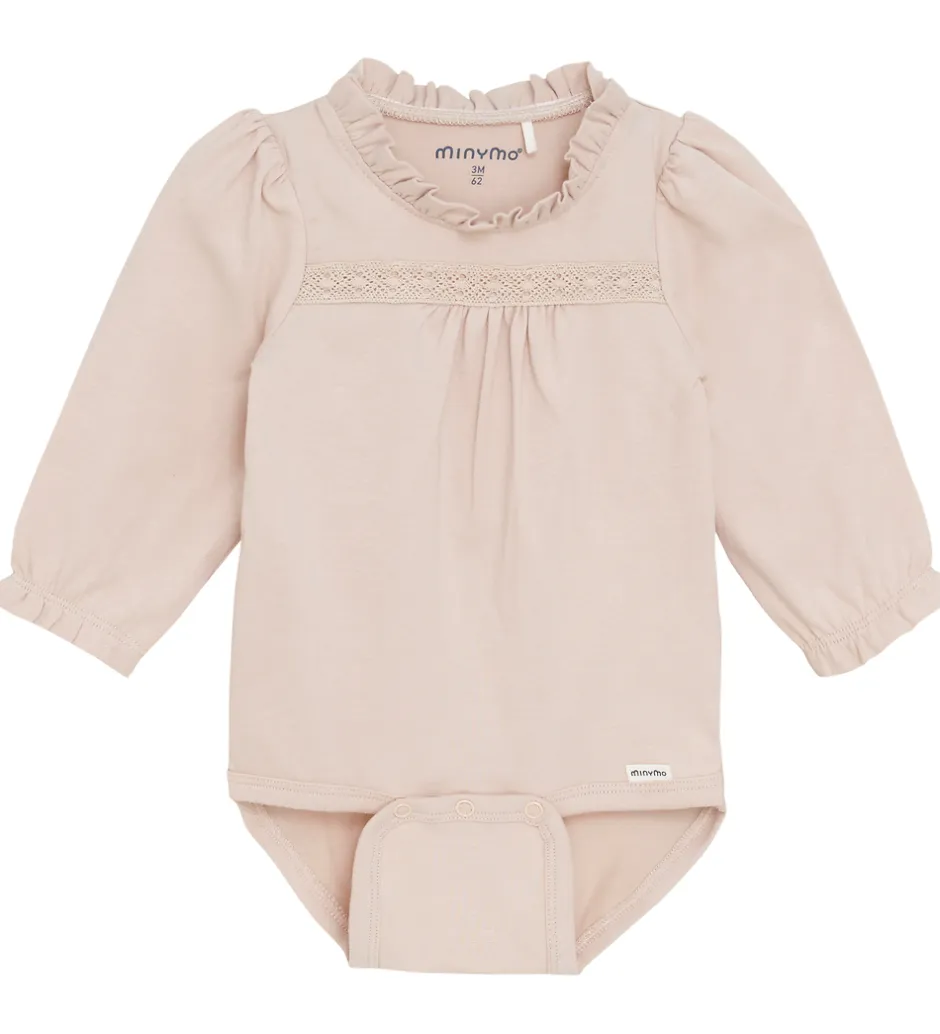 Fin Minymo body i beige med et blondebånd over brystet. Bodyen har en rund, elastisk halsudskæring med flæser i kanten og trykknapper ved skuldrene. Den har lange ærmer med puf ved skuldrene og elastik ved håndleddene. Fortil er der fine rynker under brystet, og bodyen lukkes med trykknapper mellem benene.