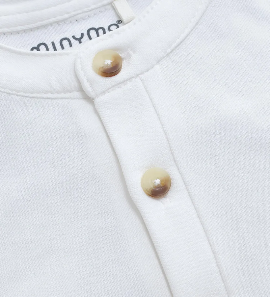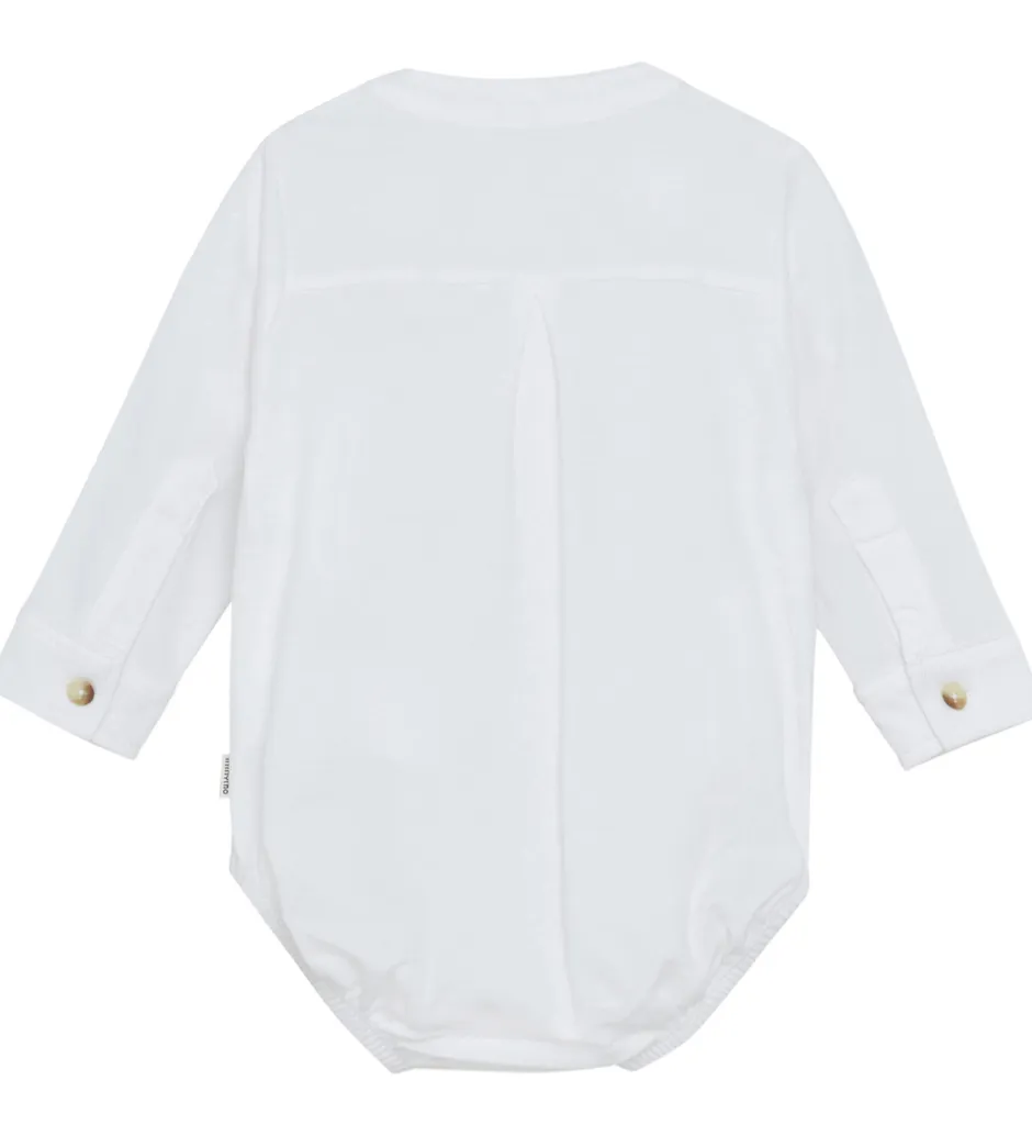 Elegant Minymo body i hvid. Bodyen har en kinakrave og fine knapper fortil. Den har lange ærmer med manchetknapper og lukkes mellem benene med trykknapper.