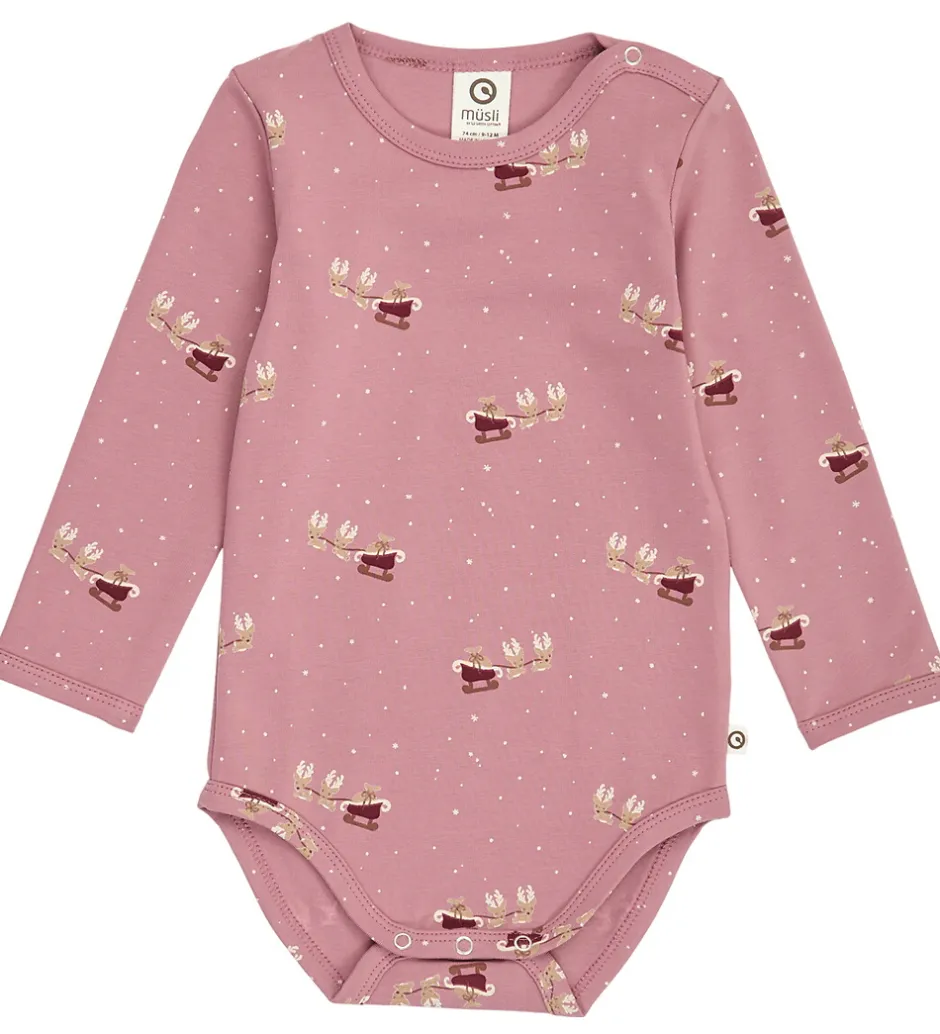 Charmerende Müsli body med lange ærmer i en blød rosa nuance. Bodyen har et sødt juleprint med små rensdyr og hvide prikker, der giver et fint udtryk. Müsli sikrer en god pasform med ribkant ved ærmerne og en praktisk lukning med trykknapper i bunden og ved skulderen.