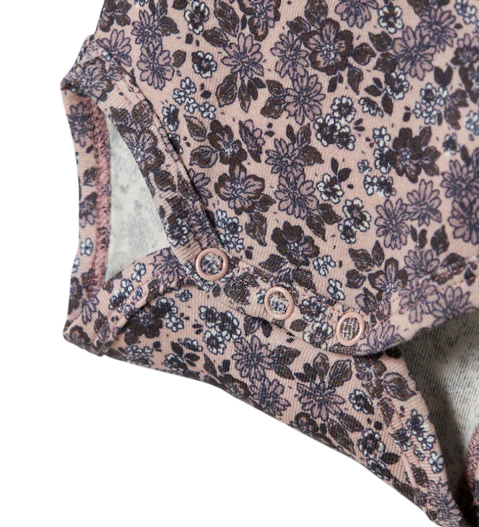 Elegant Name It body i rosa med med et delikat blomsterprint i lilla nuancer. Bodyen har lange ærmer, der giver en tæt pasform, og en rund halsudskæring med fine kantdetaljer. Den lukkes praktisk med trykknapper i bunden, hvilket sikrer nem påklædning. Name It tilbyder en stilfuld løsning til enhver garderobe.
