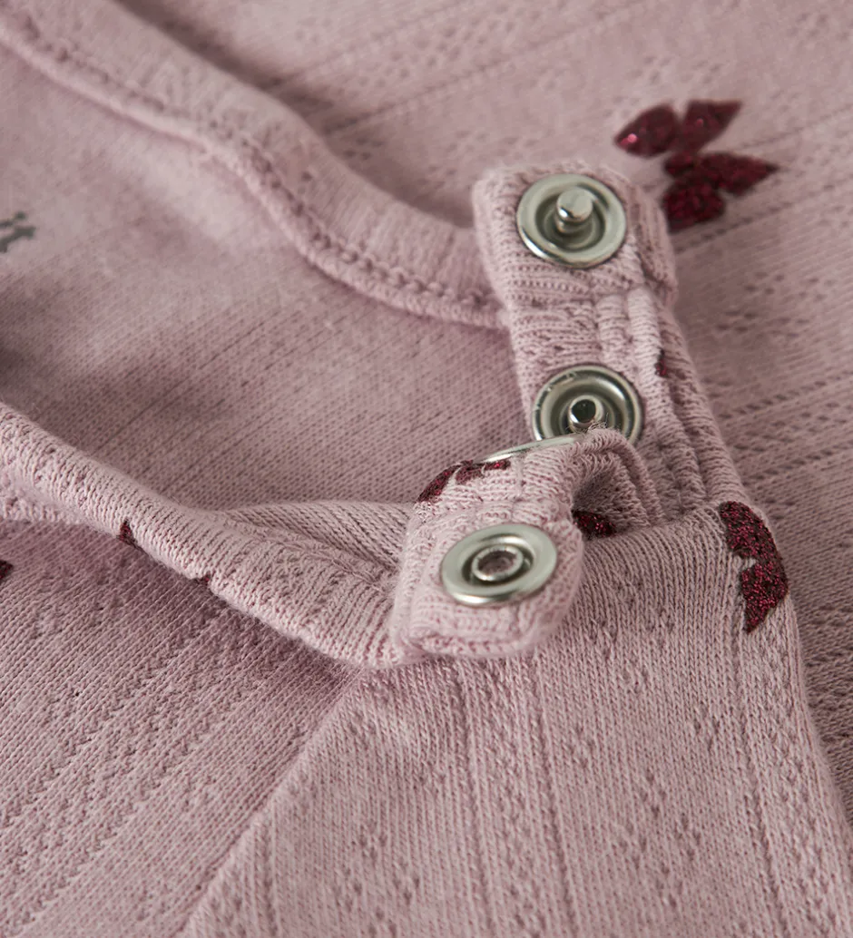 Charmerende Name It body med lange ærmer i en blød rosa nuance. Bodyen prydes af et flot print af små sløjfer i rød glimmer, der giver et sødt udtryk. En elegant sløjfedetalje pryder halsudskæringen, og bodyen har et flot hulmønster.