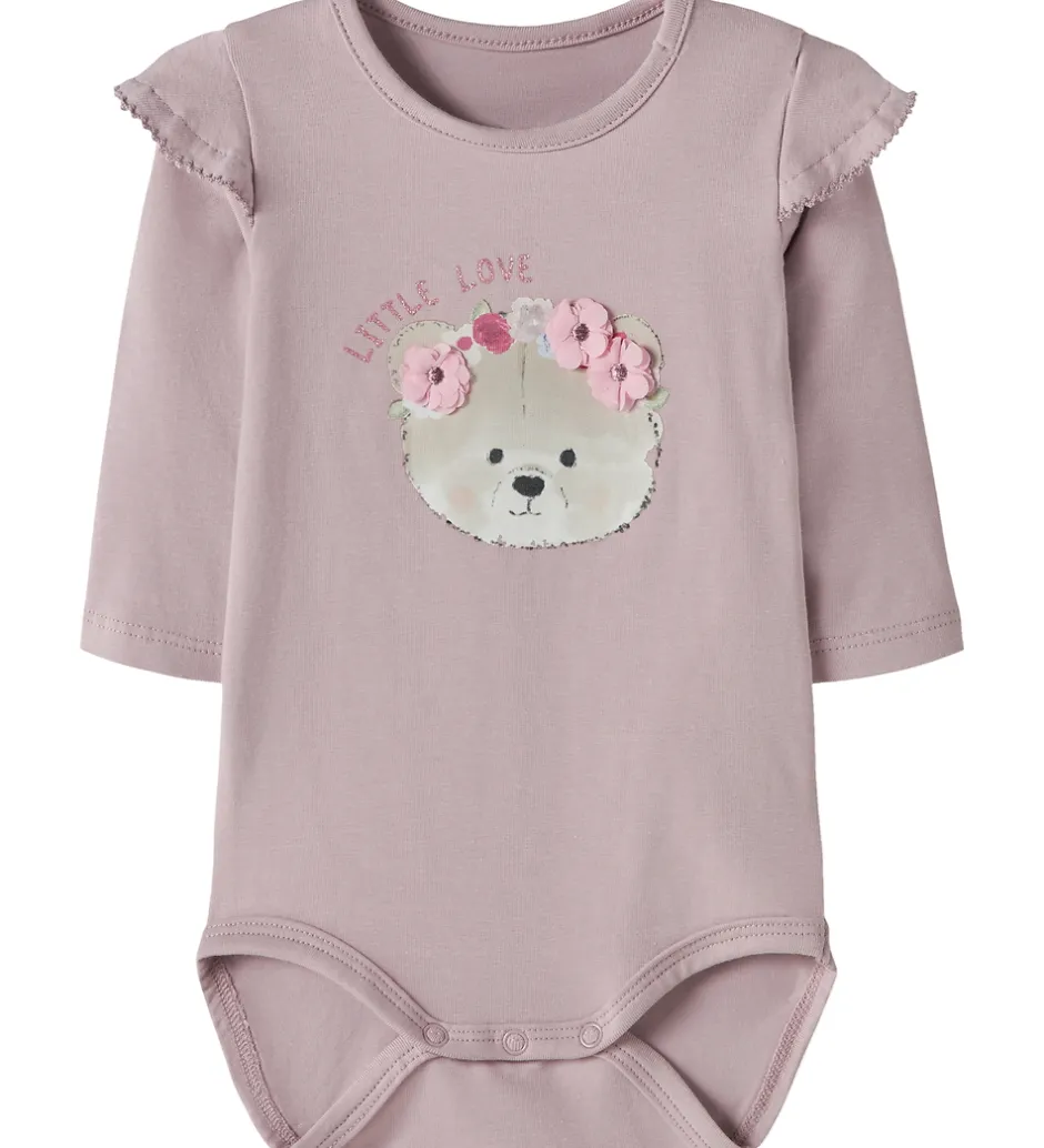 Yndig Name It body i rosa med et print på fronten af en bamse med blomsterapplikationer ved ørerne. Name It bodyen har en rund halsudskæring med trykknapper ved venstre skulder. Den har lange ærmer med flæsedetaljer ved skuldrene. Bodyen lukkes med trykknapper mellem benene.