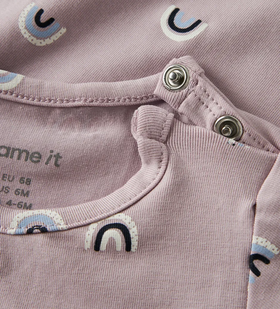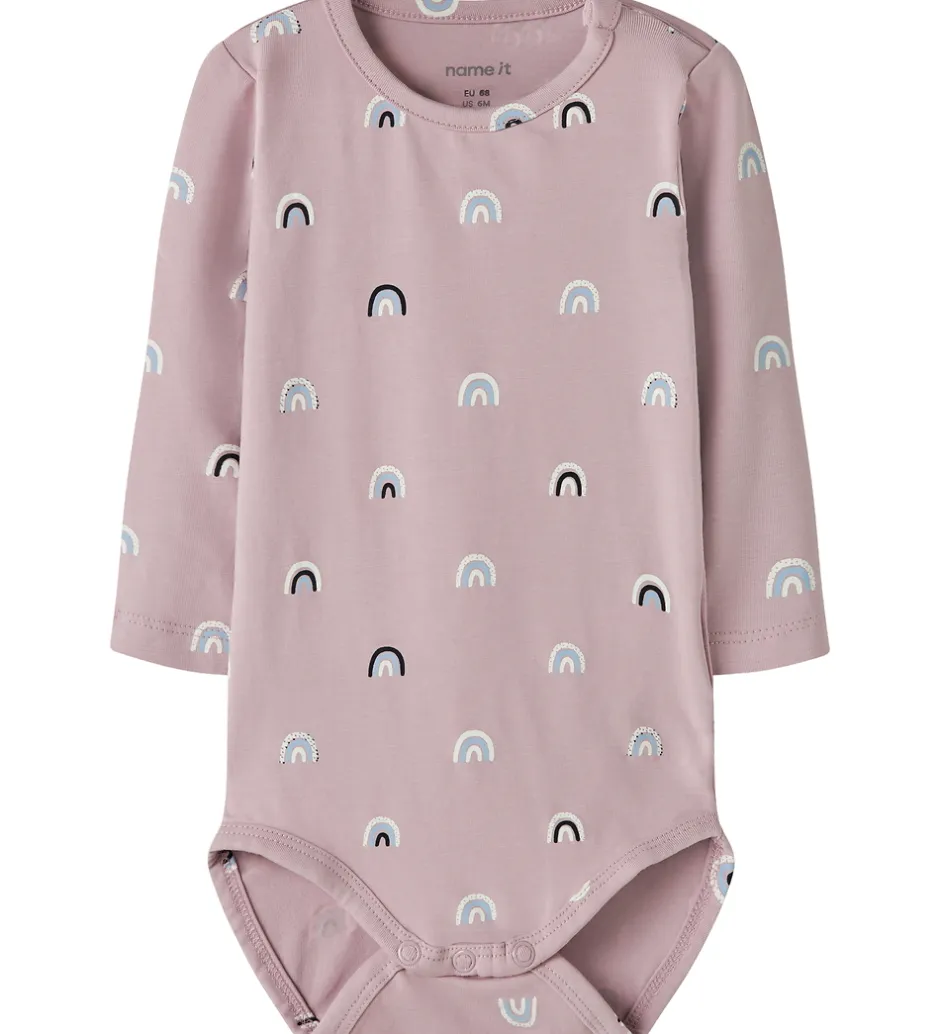 Charmerende Name It body med lange ærmer og et sødt regnbuemønster på en sart rosa baggrund. Bodyen har en rund halsudskæring og fine detaljer ved kanten. Ærmerne afsluttes pænt, og bodyen har praktiske trykknapper i bunden, som gør det let at skifte.