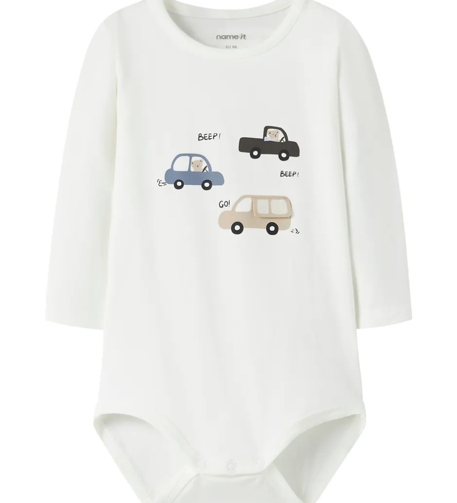 Charmerende Name It body i hvid med et fint bilprint i forskellige farver. De små biler er påtrykt fronten og giver et livligt udtryk.