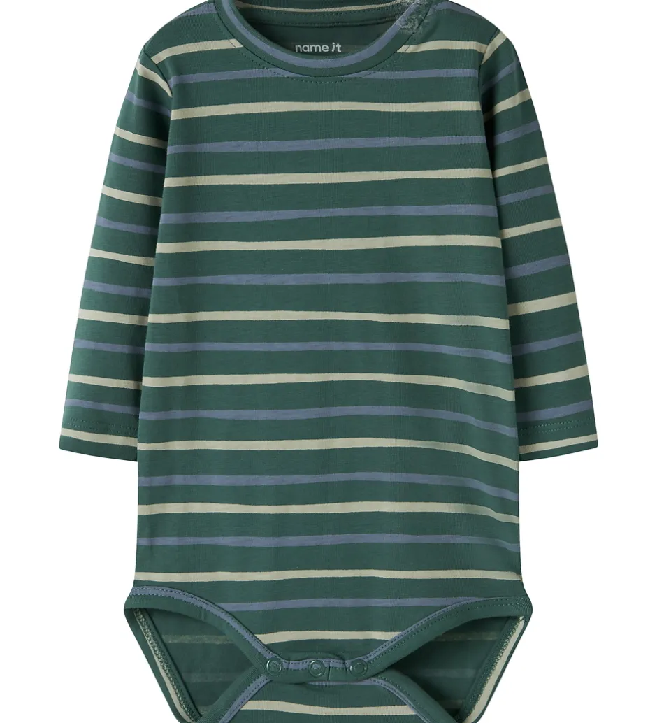 Charmerende Name It body i mørkegrøn med smalle striber i beige og blå nuancer. Bodyens design er enkel og tidløst, hvilket gør den til et alsidigt valg.