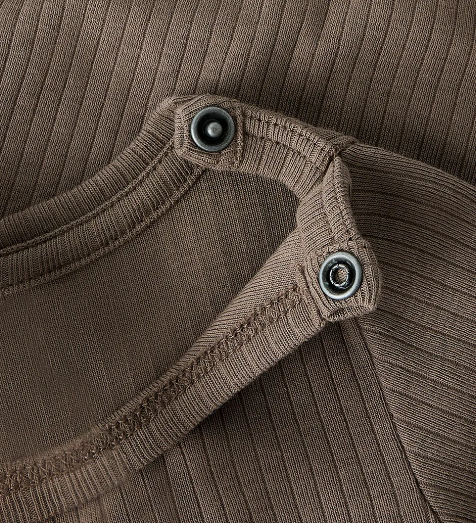 Flot Name It body i en varm brun nuance med ribstruktur. Bodyen har lange ærmer og en rund halsudskæring med en trykknap ved venstre skulder. Bodyen lukkes mellem benene med trykknapper.