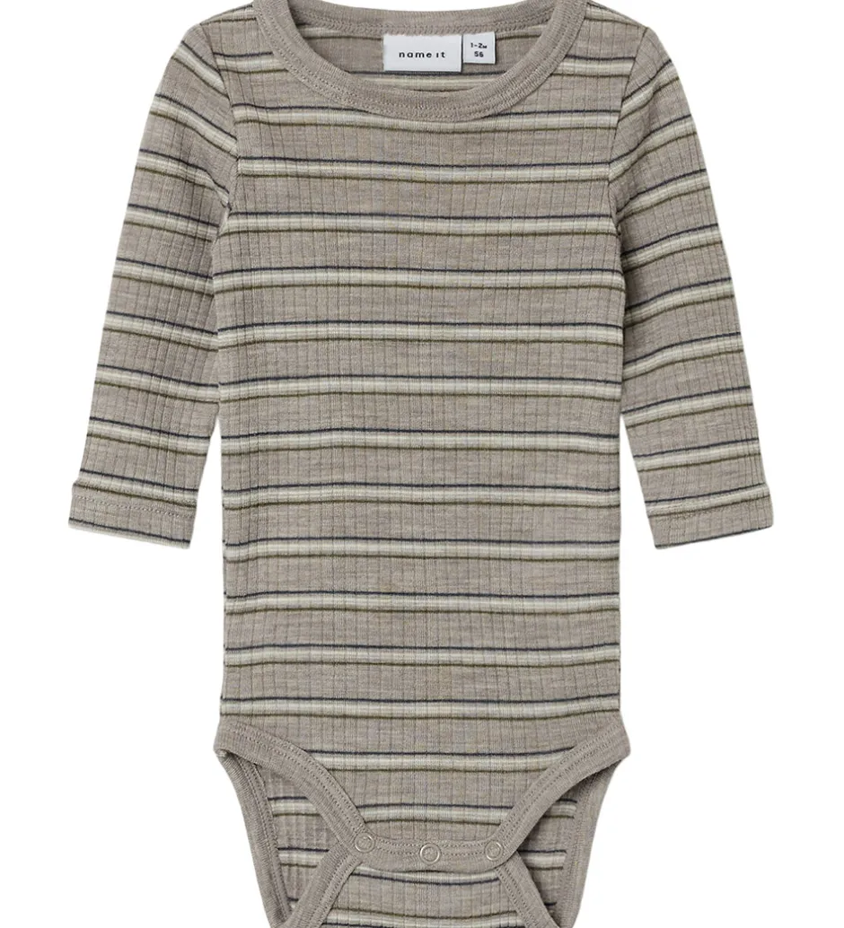 Skøn Name It body i gråbrun med ribstruktur og vandrette striber i blå, hvid og grøn. Bodyen har en rund halsudskæring og lange ærmer. Den lukkes med trykknapper mellem benene. Bodyen er fremstillet af merinould og modal.