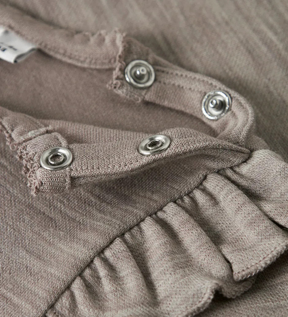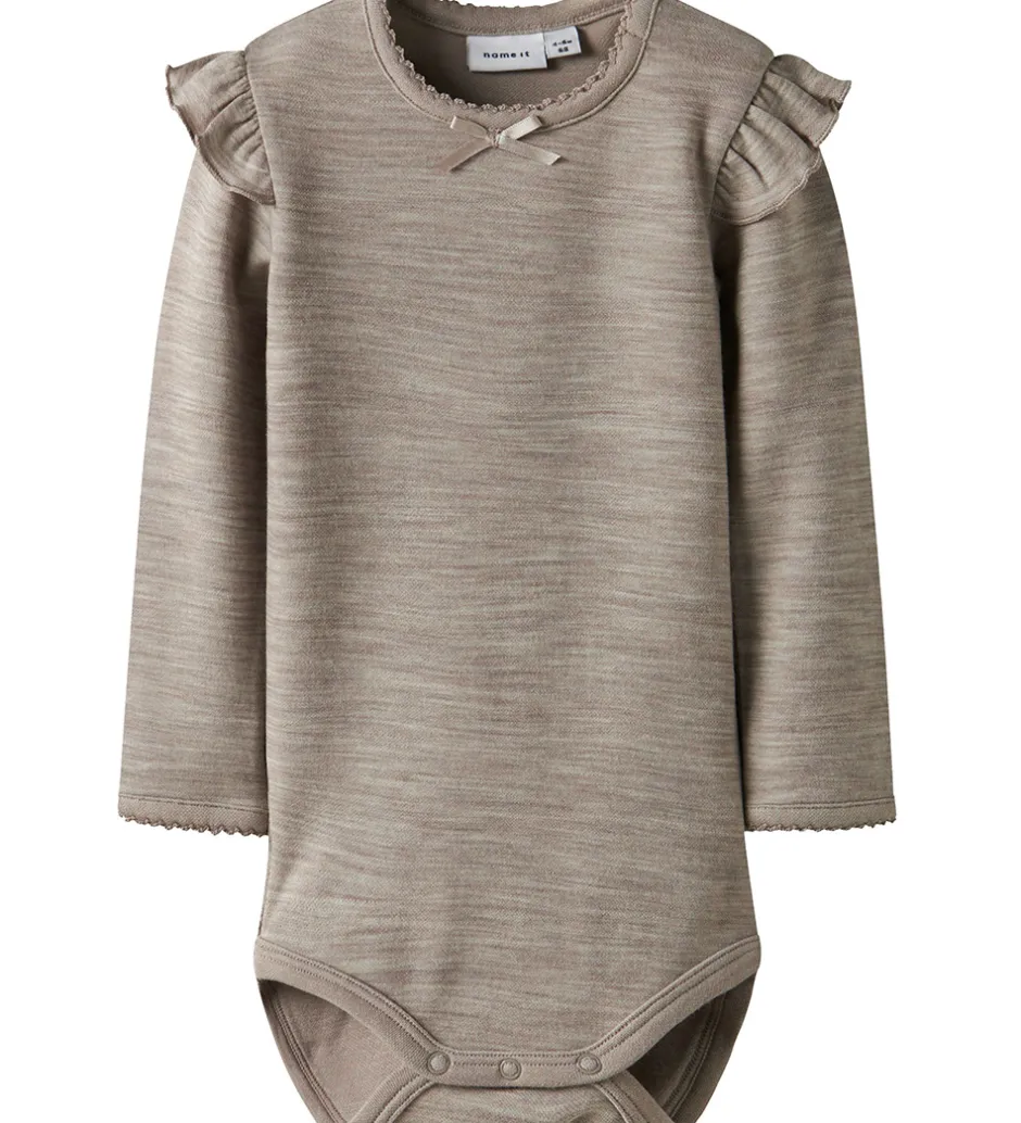 Lækker Name It body i melerer gråbrun med fine blondekanter i hals- og ærmeåbninger. Bodyen har en fin sløjfedetalje ved halsen og lange ærmer med flæser ved skuldrene. Bodyen lukkes med trykknapper ved venstre skulder og mellem benene. Bodyen er fremstillet i en blød blanding af merinould og viskose.