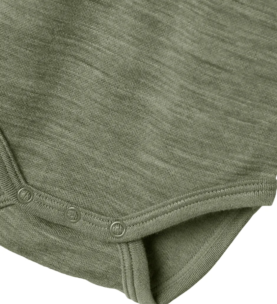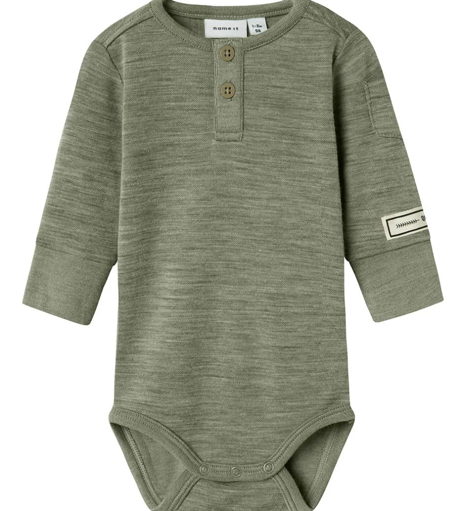 Fin Name It body i gråmeleret med en lille, hvid applikation på venstre ærme. Bodyen har en rund halsudskæring med trykknapper foran, og lange ærmer med en lomme øverst på venstre ærme. Den har brede ribkanter ved håndleddene, og lukkes mellem benene med trykknapper. Bodyen er fremstillet i en blød blanding af merinould og viskose.