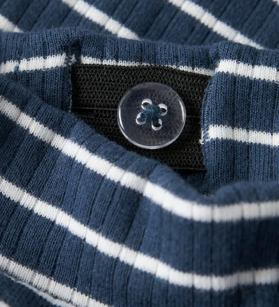 Stilfuldt Name It bodysæt i mørkeblå med hvide striber bestående af en body og et par bukser. Sættet har fin ribstruktur.