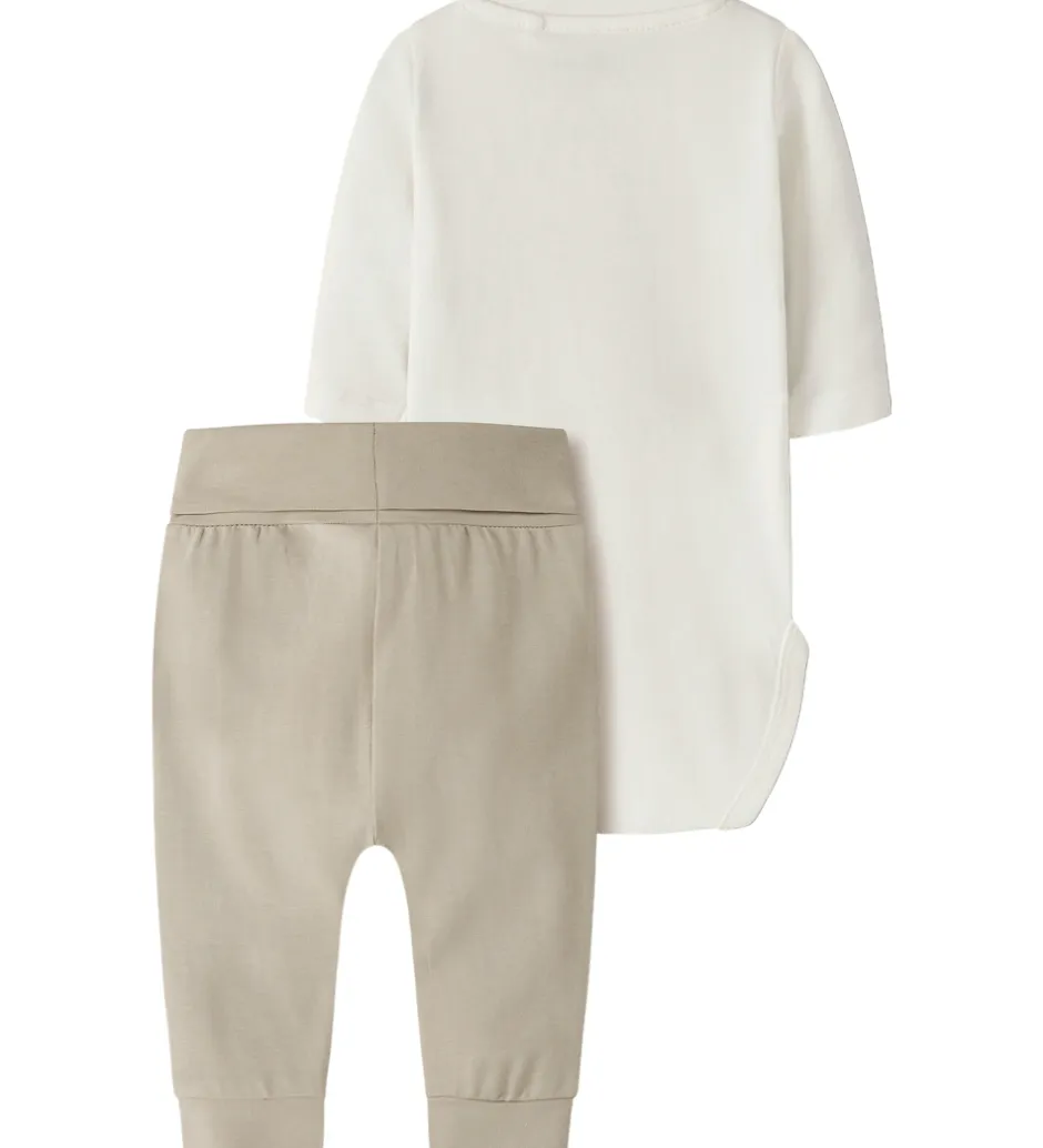 Elegant Name It sæt bestående af en body og et par bukser. Bodyen er hvid og har en påsyet, beigefarvet vest med fine knapper foran og butterfly. Bukserne er ensfarvet beige.