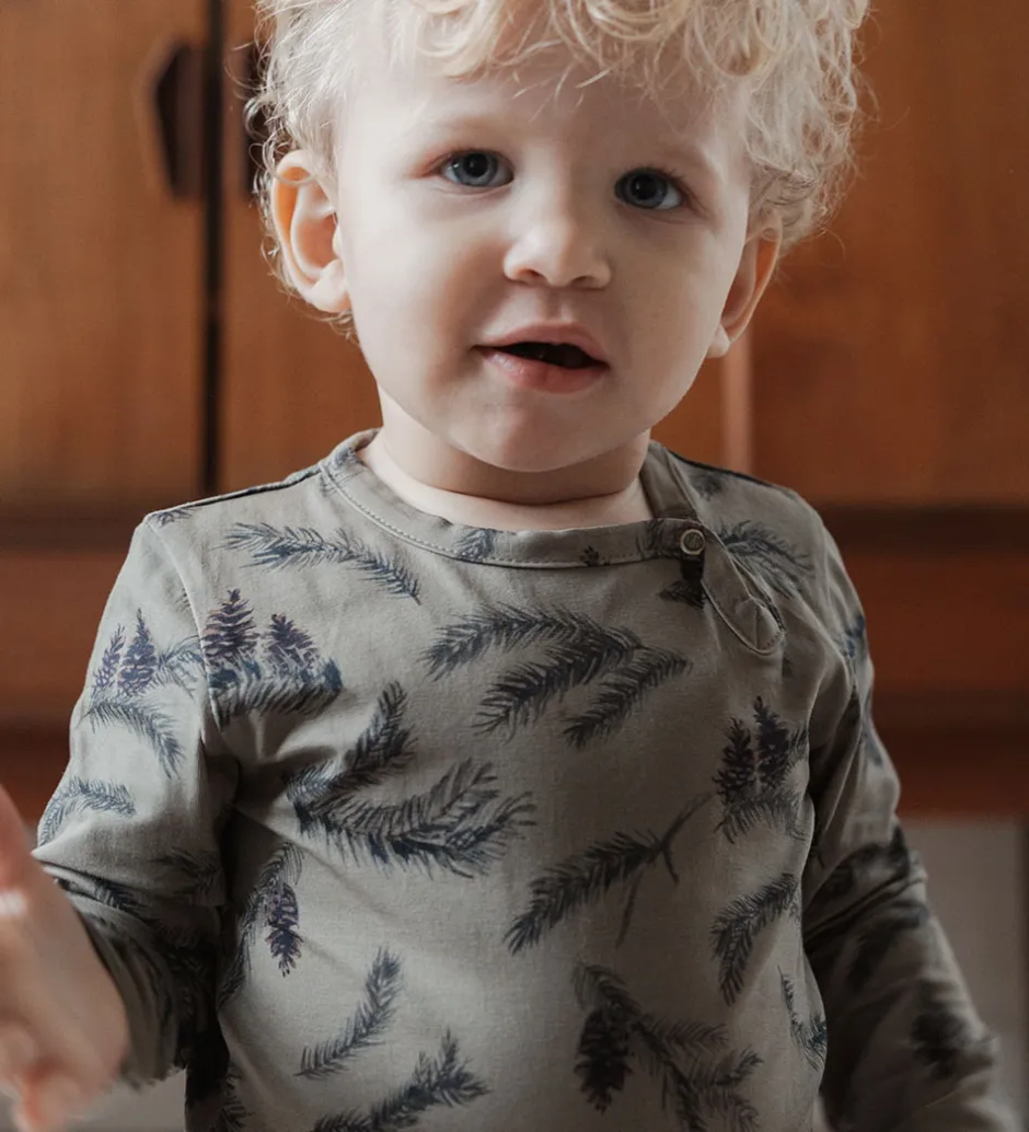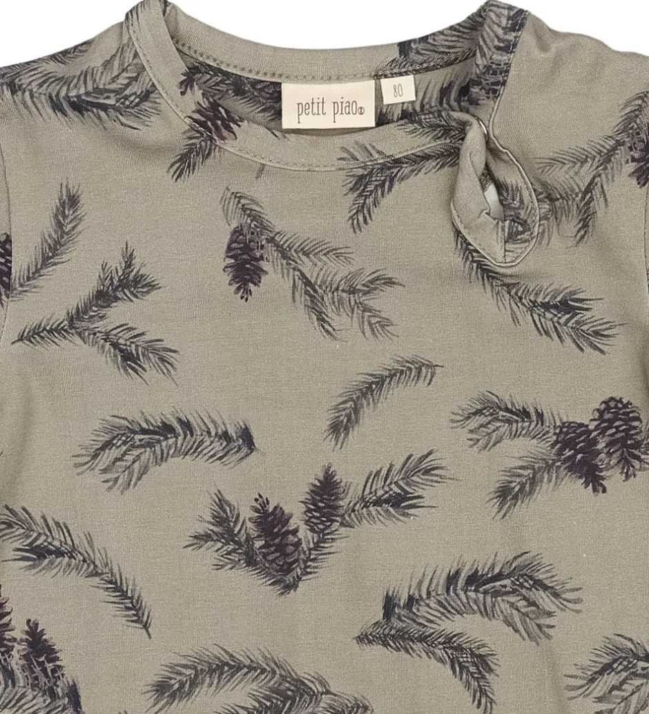 Flot Petit Piao body med lange ærmer i en afdæmpet, grønlig nuance dekoreret med et stilfuldt mønster af grantræer. Den unikke print bringer et naturligt element til designet.