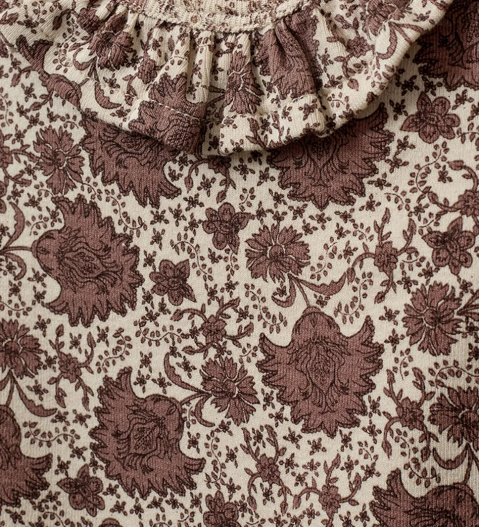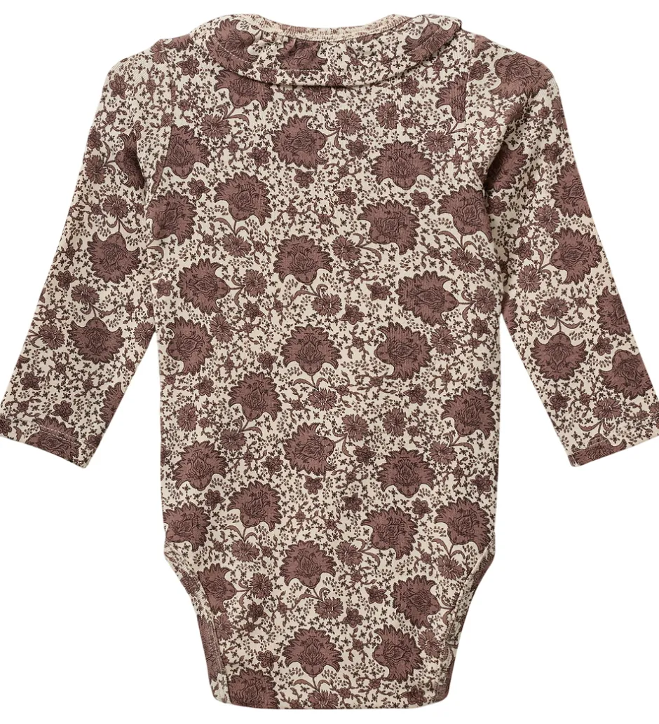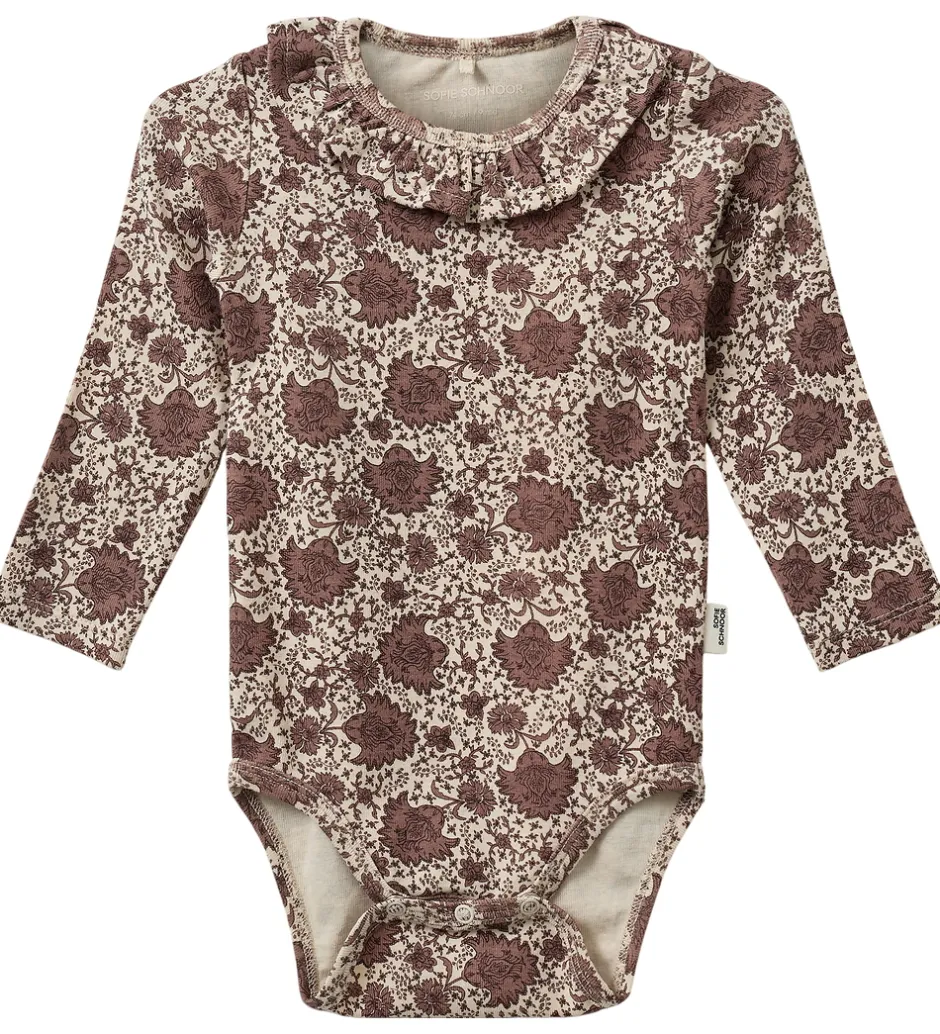 Charmerende Sofie Schnoor body med et detaljeret blomsterprint i mørkerosa og creme nuancer. Bodyen har lange ærmer og en dekorativ flæsekant ved halsudskæringen, der tilføjer et unikt touch.