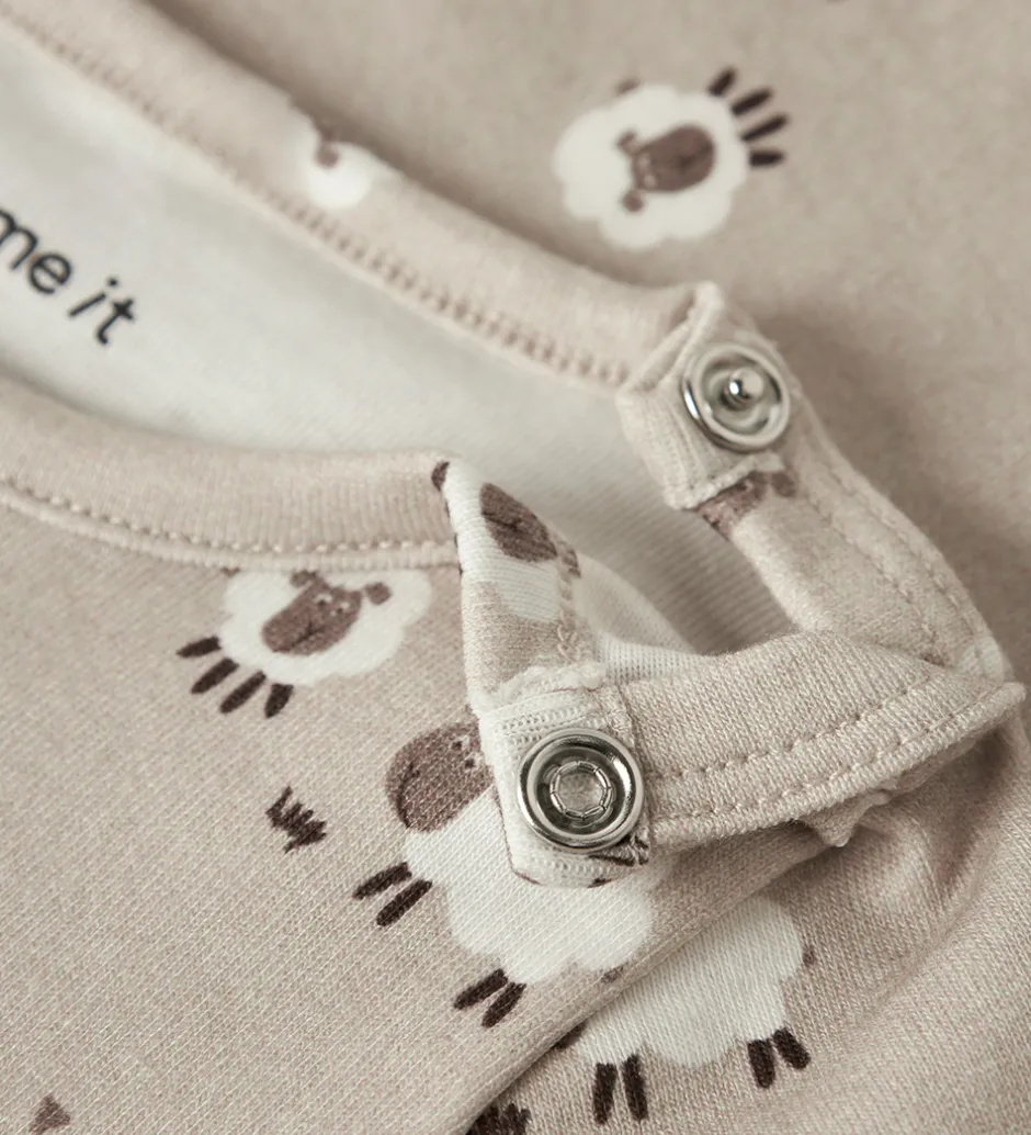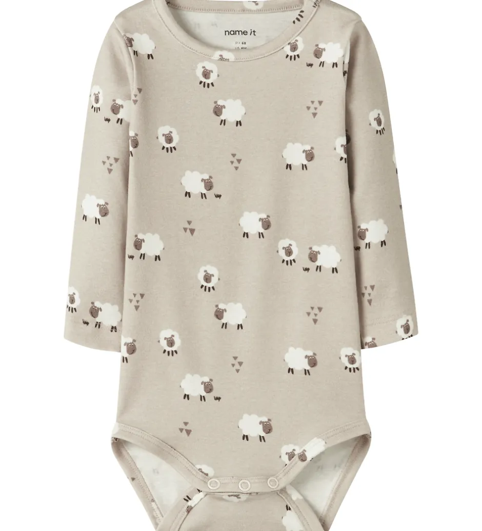 Sød Name It body i beige med et alloverprint af får. Bodyen har en rund halsudskæring med trykknapper ved venstre skulder og lange ærmer. Den lukkes mellem benene med trykknapper.