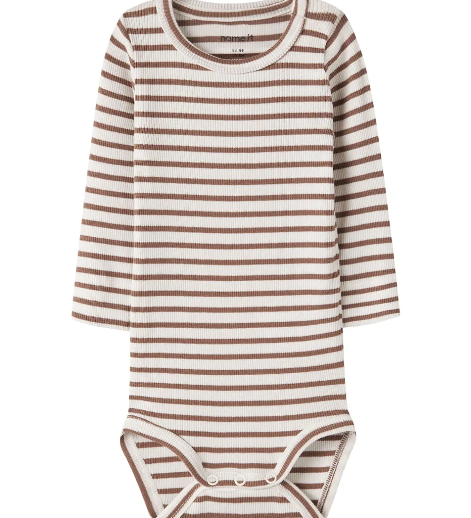Flot Name It body med lange ærmer i et stribet mønster i hvid og brun. Bodyen har ribstruktur og en rund halsudskæring med en trykknap ved venstre skulder. Den lukkes med trykknapper mellem benene.