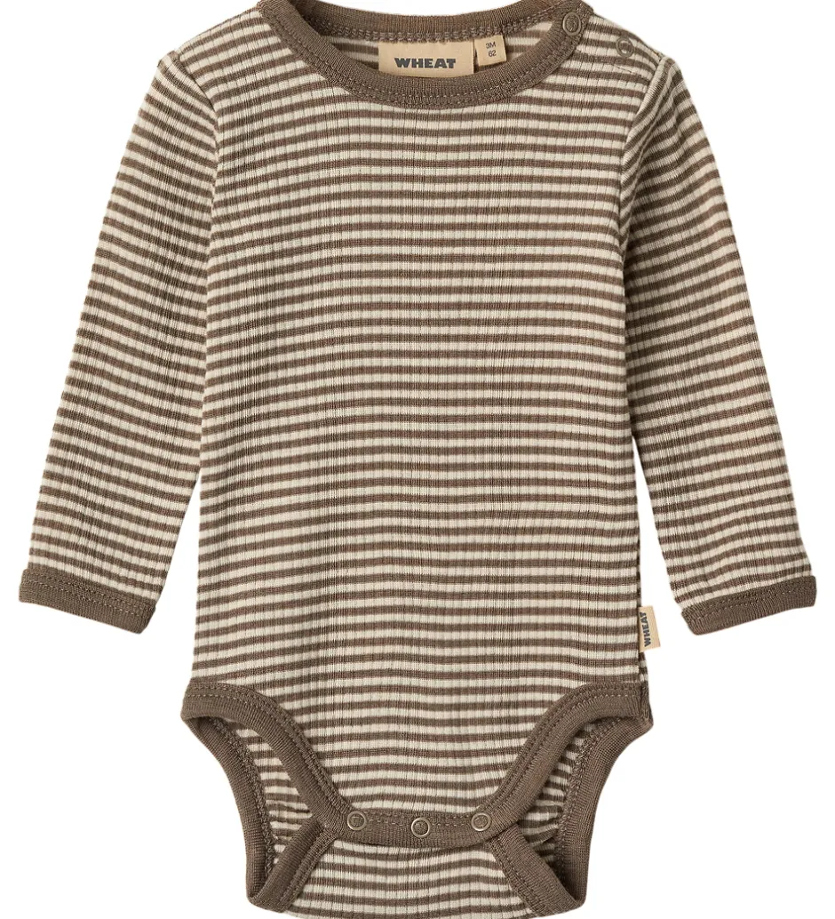 Enkel Wheat body i et stilfuldt, stribet mønster med jordnære nuancer af brun og beige og med ribstruktur. Bodyen har lange ærmer og er designet med klassiske, runde kanter ved både halsen og ærmerne, der giver et blødt touch. Wheat bodyen lukkes nemt med praktiske trykknapper i bunden, så den er let at håndtere.