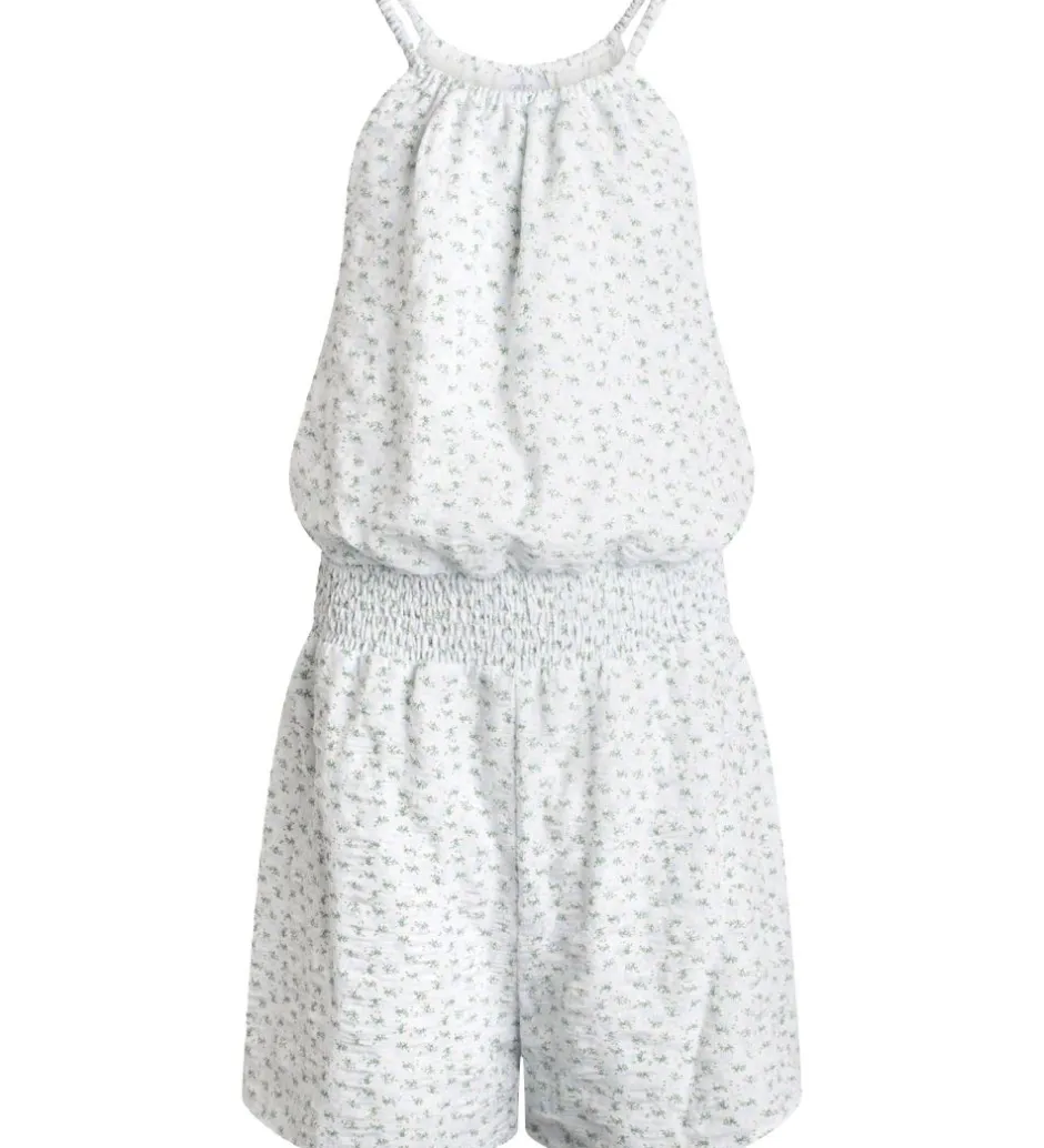 Sød Grunt buksedragt i hvid med et allover print af små lyseblå blomster med grønne stilke og blade.