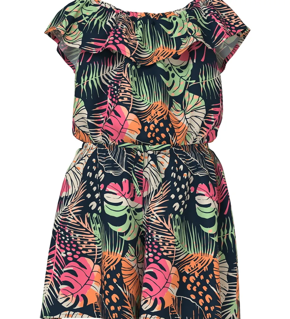 Fremragende Name It buksedragt med et tropisk bladmønster i grønne, pink, orange og beige nuancer på en mørk baggrund.