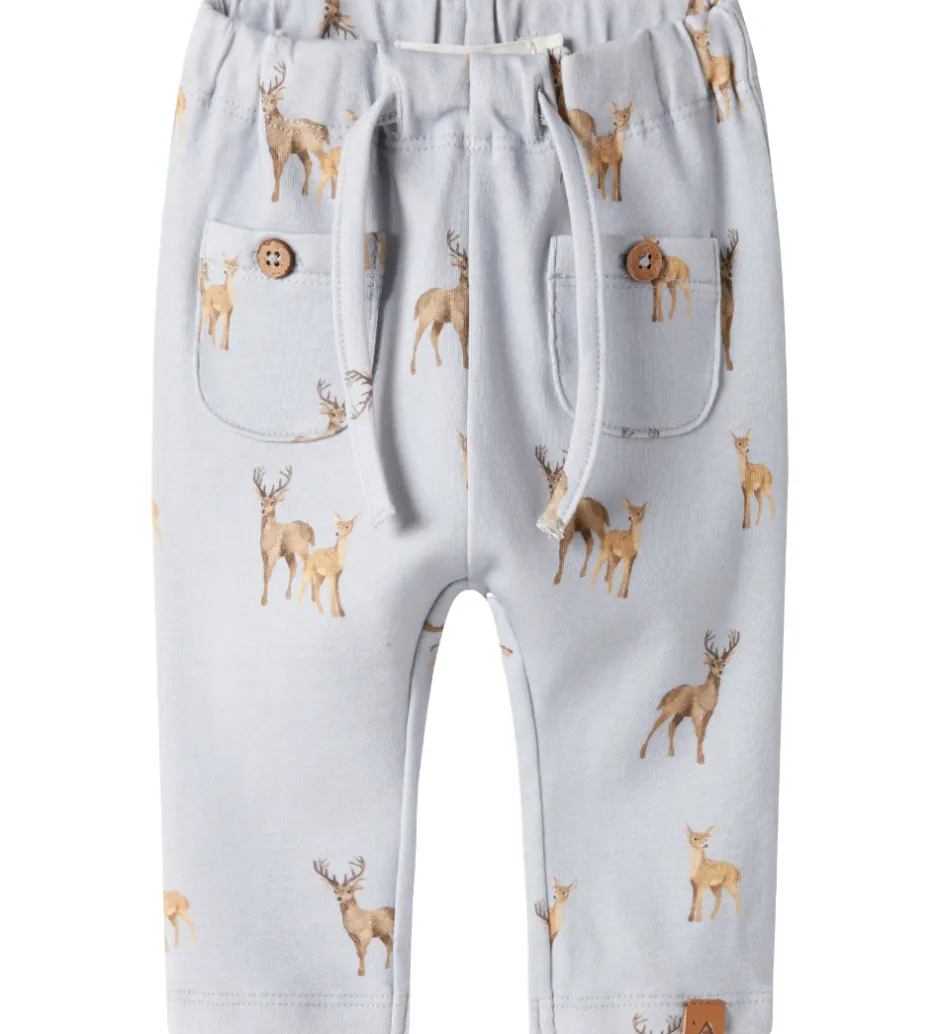 Charmerende bukser fra Lil Atelier i lyseblå med et alloverprint af krondyr i brunlige nuancer. Lil Atelier bukserne er designet med en elastisk talje, som kan justeres med knapper indvendigt. Fortil er der dekorative snører og fine lommer.