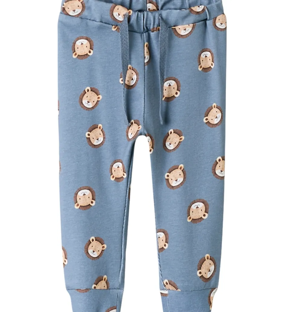 Skønne bukser fra Name It i blå med et alloverprint af løvehoveder. Name It bukserne er udstyret med en elastisk talje, som kan justeres med knapper indvendigt. Foran er der dekorative snører, og i benåbningerne er der brede kanter.