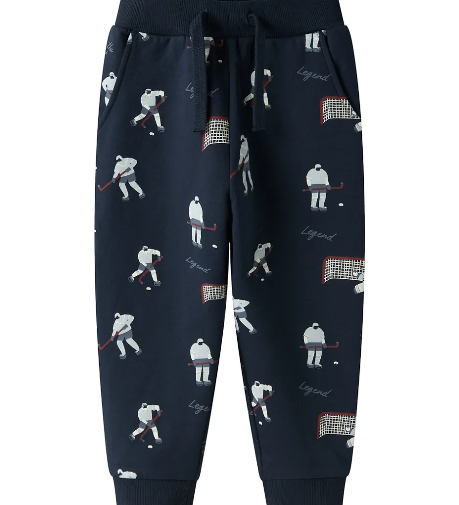 Stilfulde Name It sweatpants i navyblå med et allover hockeyprint. Sweatpantsene har en elastisk talje, som kan justeres med knapper indvendigt. Fortil er der dekorative snører og en lomme i hver side. Indvendigt er der blødt, børstet bomuld.