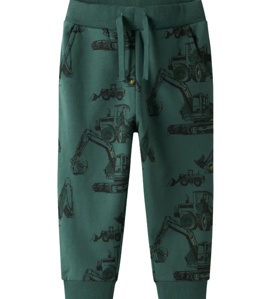Stilfulde Name It sweatpants i mørkegrøn med et alloverprint af gravemaskiner i sort med gule detaljer. Sweatpantsene er designet med en bred elastikkant i livet, som kan justeres med knapper indvendigt. Fortil er der dekorative snører og en lomme i hver side. Sweatpantsene har ribkanter ved anklerne, og indvendigt er der blødt, børstet bomuld.