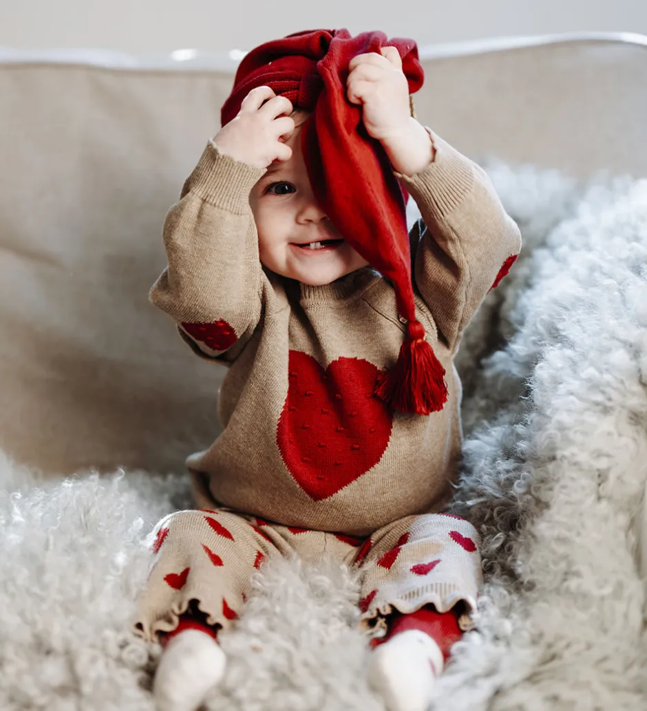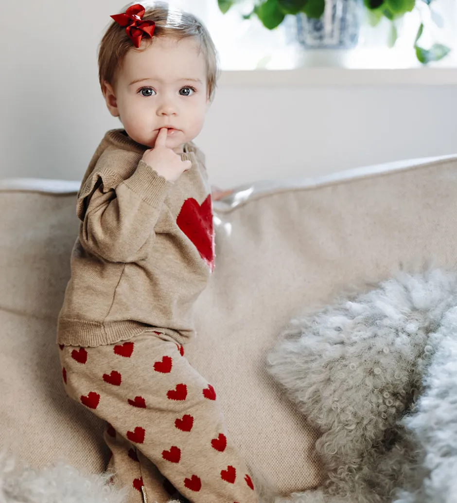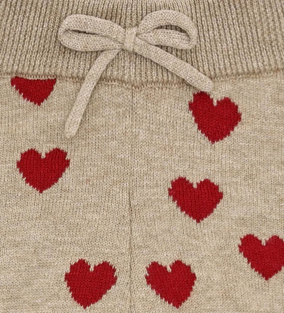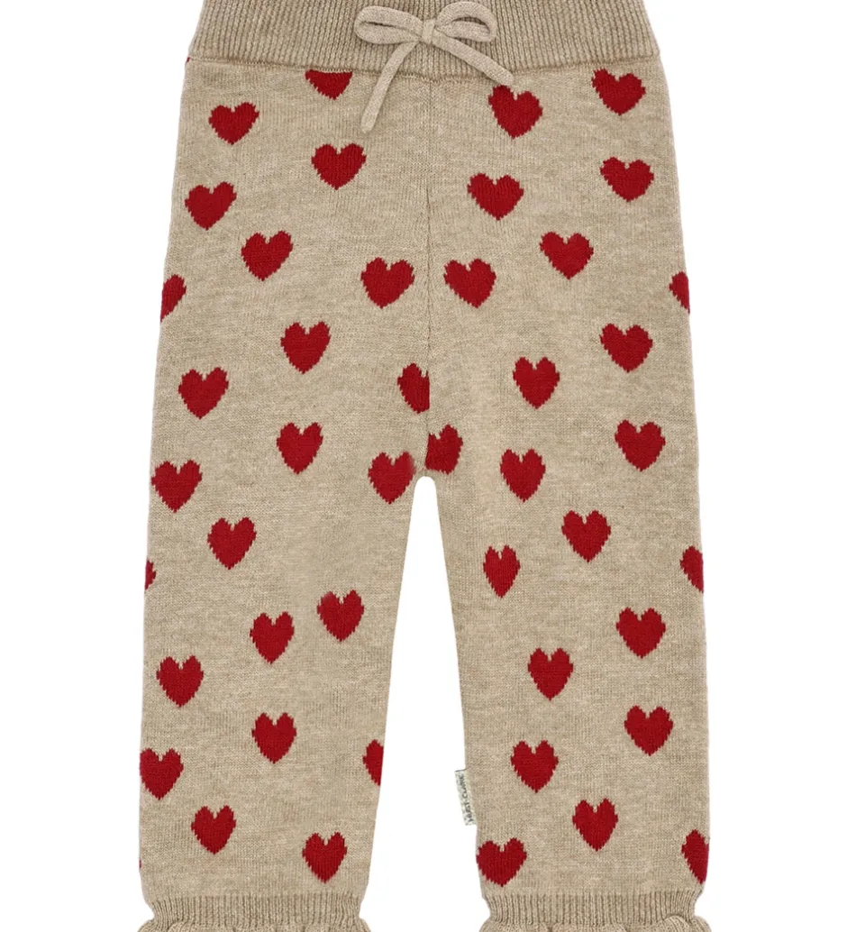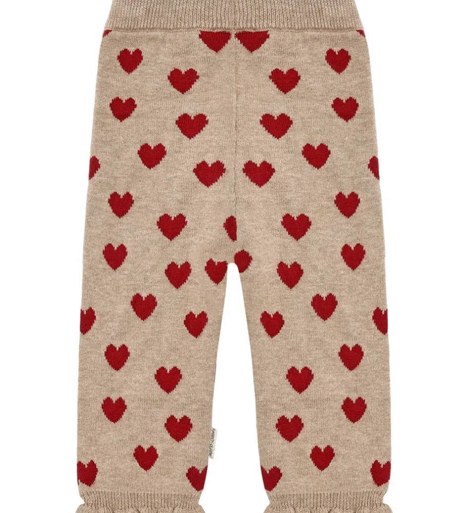 Flotte Hust and Claire bukser i beige med røde hjerter, og de er lavet i en strikket kvalitet. Bukserne har lange ben med flæsekanter, og i livet har de en bredelastikkant med en dekorativ sløjfe fortil.