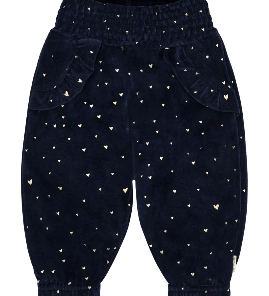 Flotte Hust and Claire velourbukser i navy velour med et print med små, guldfarvede hjerter. Hust and Claire velourbukserne har lange ben med elastikkanter, og i livet er der en bred elastikkant. Fortil sidder der to søde flæser.