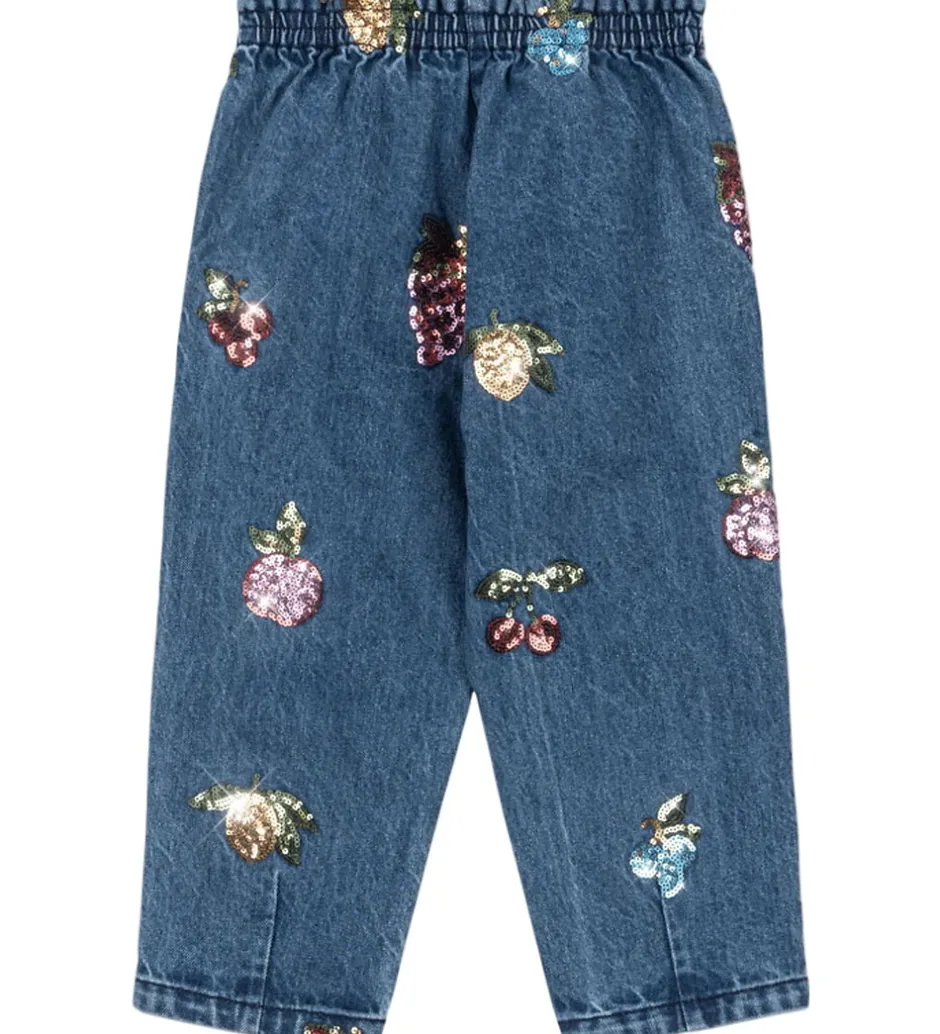 Skønne bukser fra Konges Sløjd i en flot, blå denimfarve med et iøjnefaldende pailletmotiv.