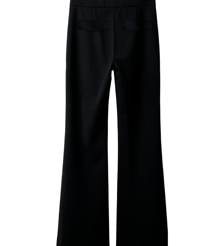 Stilfulde bukser fra LMTD i sort. LMTD bukserne har et enkelt design med en tætsiddende pasform omkring lårene og vidde ved anklerne. Bukserne har elastisk talje, som kan justeres med knapper indvendigt. De lukkes foran med en knap og lynlås. Fortil er der to lommer, og bagpå er der to snydelommer.