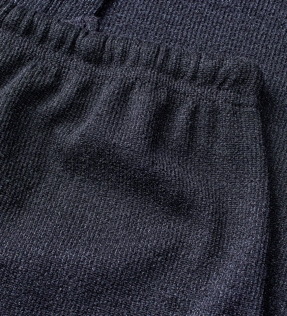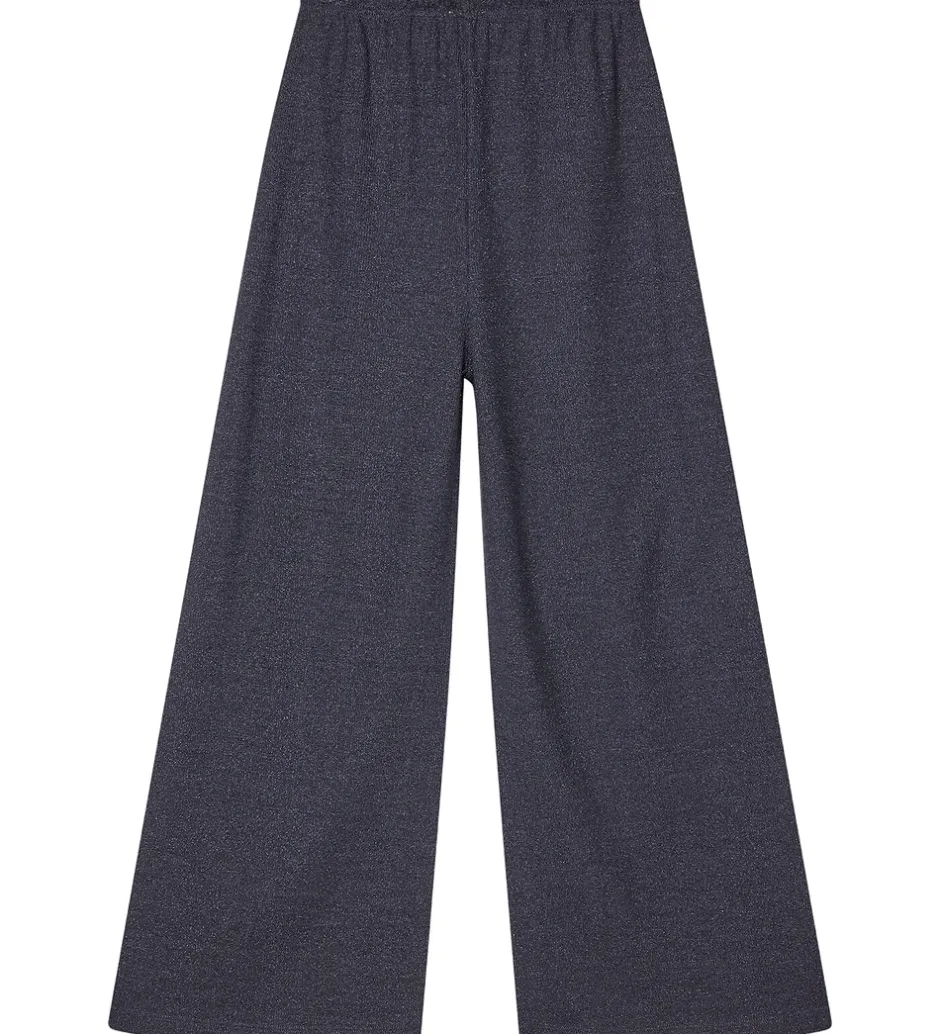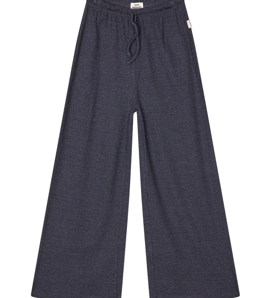 Smukke bukser fra Mads Nørgaard i navyblå med glimmer og ribstruktur. Mads Nørgaard bukserne har en afslappet pasform med brede ben og en elastik i taljen, som kan justeres med snører foran.