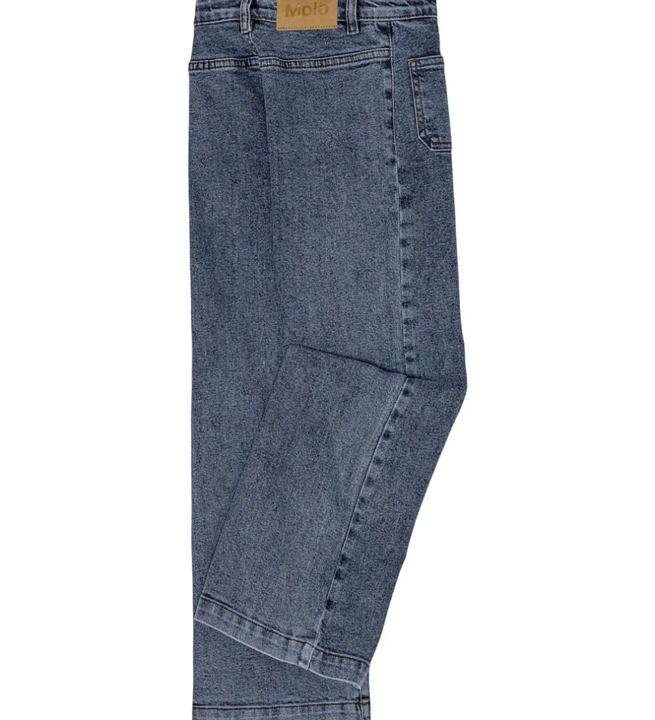Praktiske Molo jeans i en klassisk blå denimfarve. Taljen er justerbar med indvendige elastikker. Molo jeansene har pyntesyninger og åbne lommer fortil. Jeansene har bæltestropper og lukkes med en trykknap og lynlås. Jeansene er designet i relaxed fit, som passer flot til både hverdag og fest.
