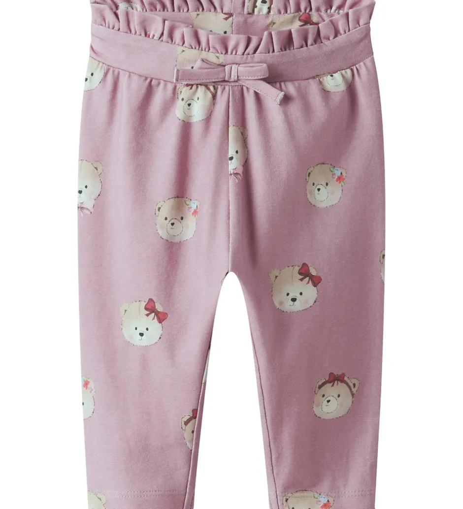 Flotte bukser fra Name It i rosa med et charmerende alloverprint af bjørneansigter. Name It bukserne har en elastisk talje med dekorative snører og justerbare knapper indvendigt, der sikrer en god pasform. Ved taljen er der en fin flæsekant og buksebenene er afsluttet med fine bølgekanter.