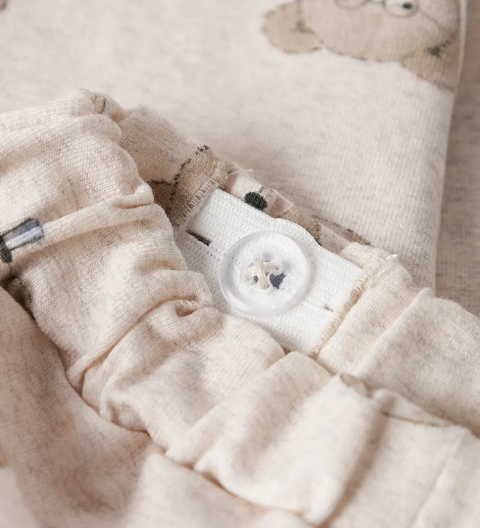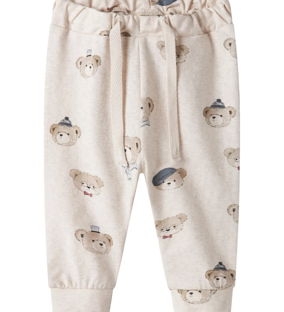 Søde bukser fra Name It i meleret beige med et charmerende alloverprint af bjørneansigter prydet med hatte og briller. Name It bukserne har en elastisk talje med justerbare knapper indvendigt og dekorative snøre fortil. Buksebenene er afsluttet med brede kanter, som giver en behagelig pasform.