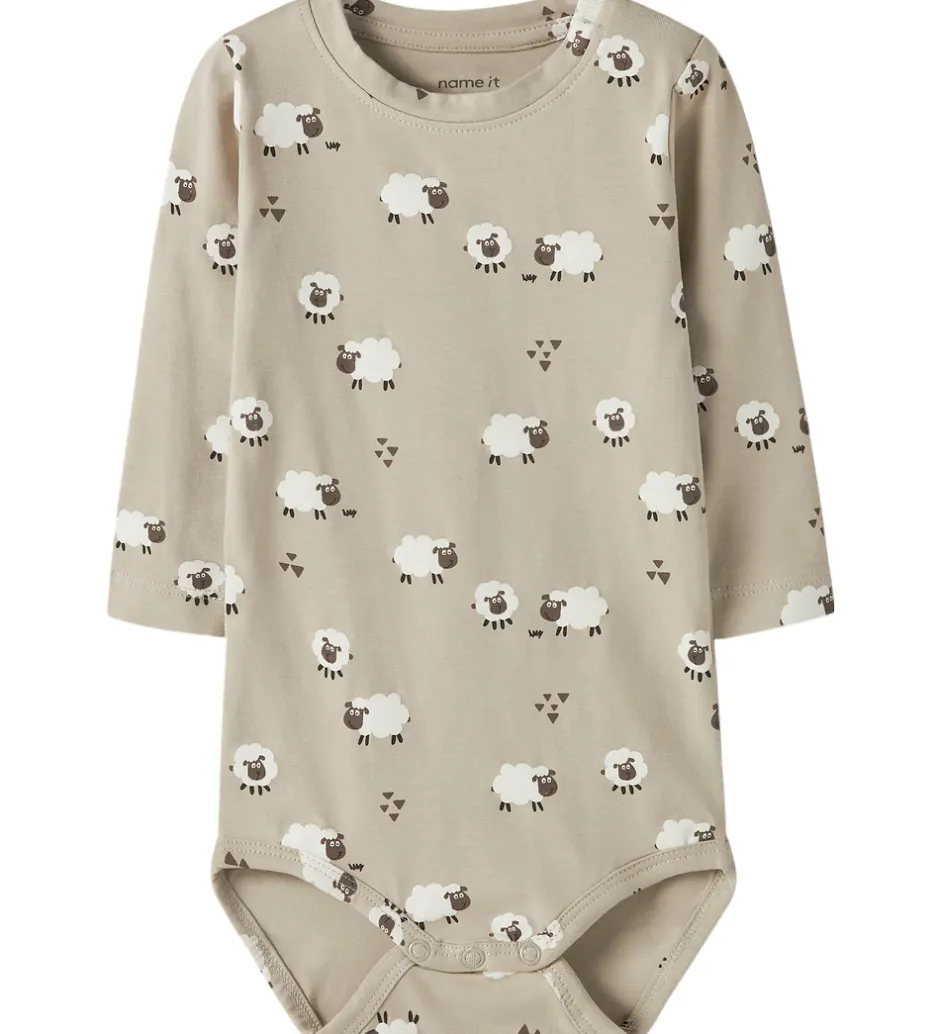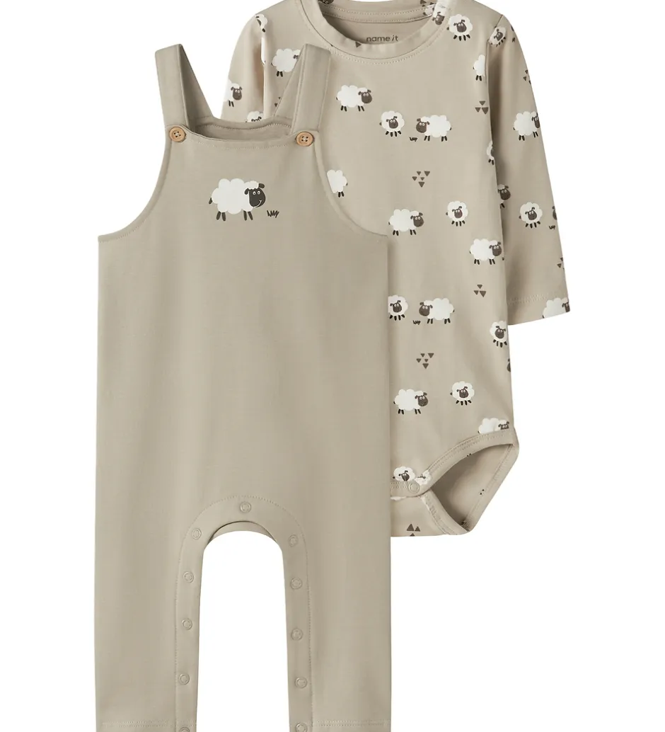 Fint Name It sæt bestående af et par smækbukser i beige med print af et får på brystet og en body med lange ærmer i beige med et alloverprint af får.