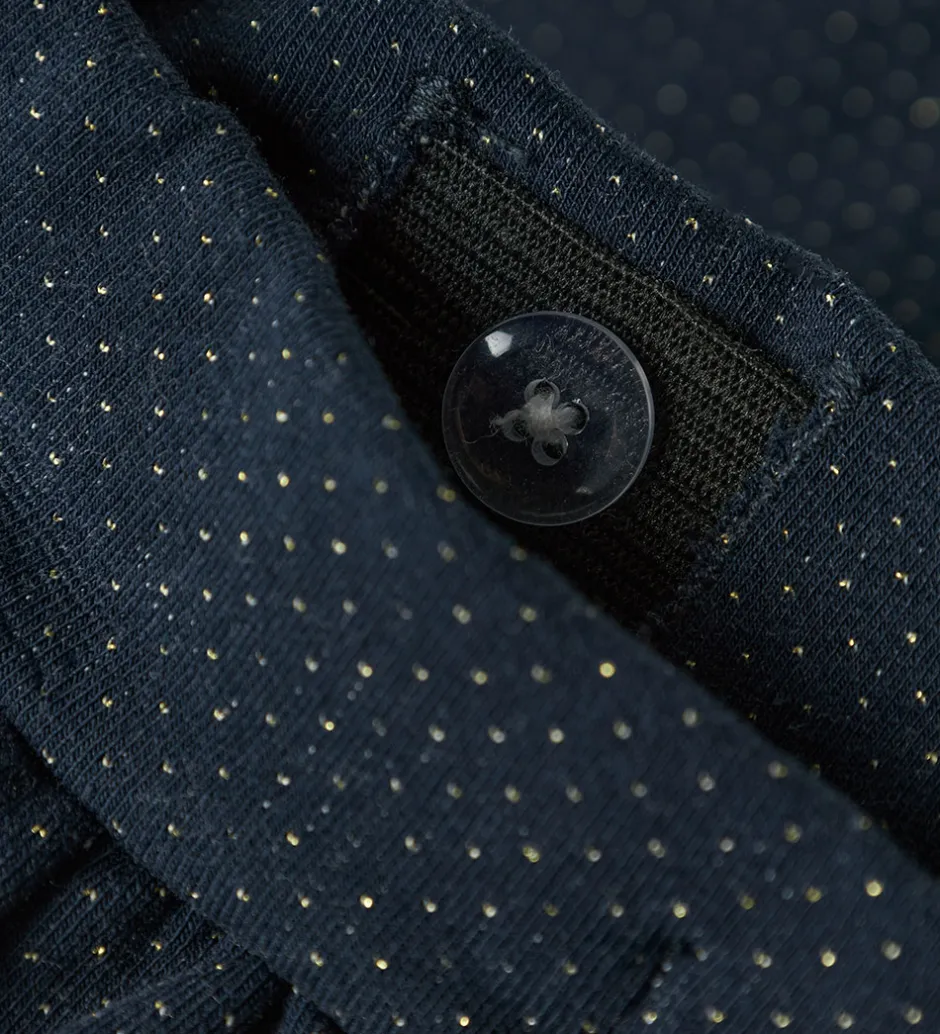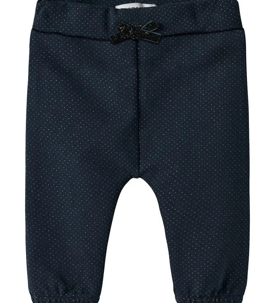 Flotte Name It sweatpants i navyblå med glimmer og en fin sløjfe foran. Sweatpantsene har en elastisk talje, som kan justeres med knapper indvendigt. I benåbningerne er der elastik, som giver en god pasform.